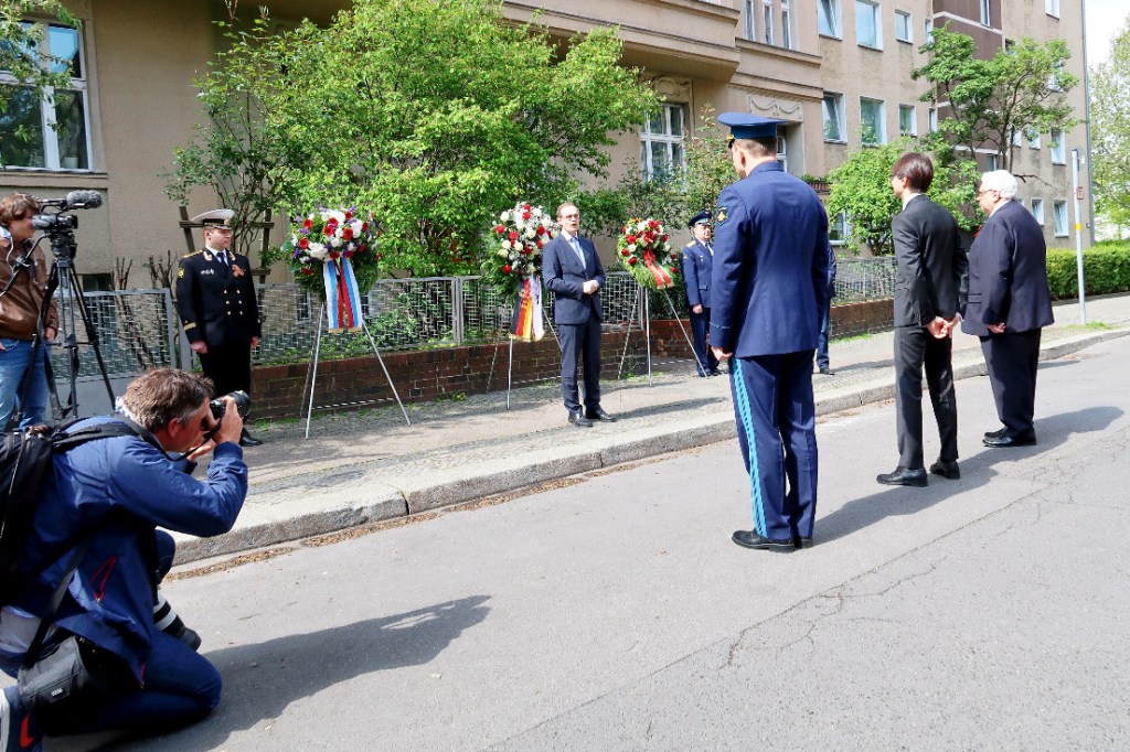 zu Ende. Am Samstagvormittag trafen sich dort 75 Jahre später Regierender Bürgermeister Michael Müller, Russlands Botschafter Sergej Netschajew und Belarus‘ Botschafter Denis Sidorenko zur Kranzniederlegung (02.05.2020).