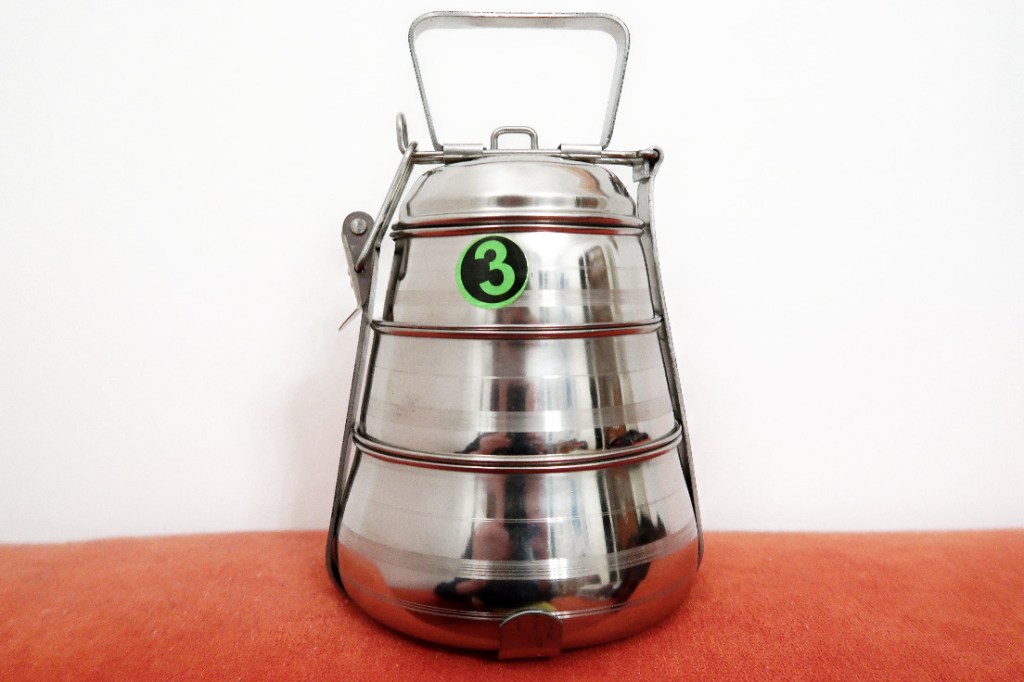 Es handelt sich um ein populäres Transportbehältnis für frisch zubereitete warme oder kalte Speisen. Es besteht aus mehreren Ebenen, jede davon eine Schüssel zur Aufbewahrung einer anderen Essenskomponente (z.B. Reis, Suppe, …). Die Schüsseln werden aufeinander gesetzt und durch den Verschlussmechanismus absolut auslaufsicher versiegelt. Speziell in MUMBAI (Maharashtra) werden diese Tiffin-Boxen millionenfach am Tag gefüllt mit gutem Essen von speziellen TIFFIN-BOTEN an die Empfänger an den Arbeitsplätzen ausgeliefert. Ohne Umfüllen lassen sich die Speisen dort im Wasserbad oder unter Einwirkung von Wasserdampf aufwärmen.