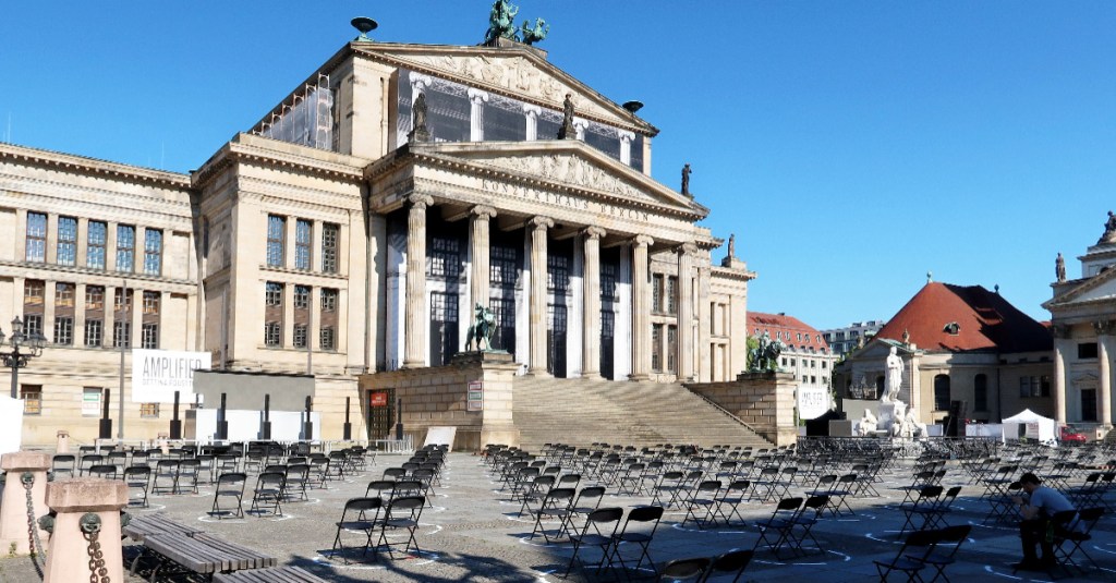 An der Hauptfassade des Konzerthauses Berlin ist zum Jubiläum noch bis 30. Juni die schwarz-weiße Installation ›AMPLIFIER‹ (Verstärker) der Berliner Künstlerin Bettina Pousttchi zu sehen. »Alles bleibt anders«.