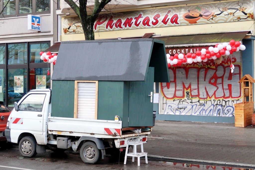 »Was hat eine Stuttgarter:in, was eine Berliner:in nicht hat?« – »Keine Ahnung!« – »Na, eine Wohnung in Berlin.«. Häuslebau quadratisch, praktisch, gut: TINY HOUSE mit Stuttgarter Autokennzeichen.