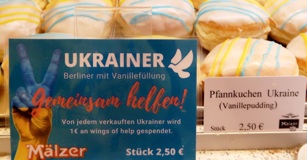 Der ›Berliner‹ is(s)t jetzt ›UKRAINER‹. Die Zivilgesellschaft zeigt weltweit Flagge gegen die Kriegsbrandstifter. Die Berliner ›Bäckerei Mälzer‹ (Steglitz & Schöneberg) bäckt für die Ukraine-Hilfe.