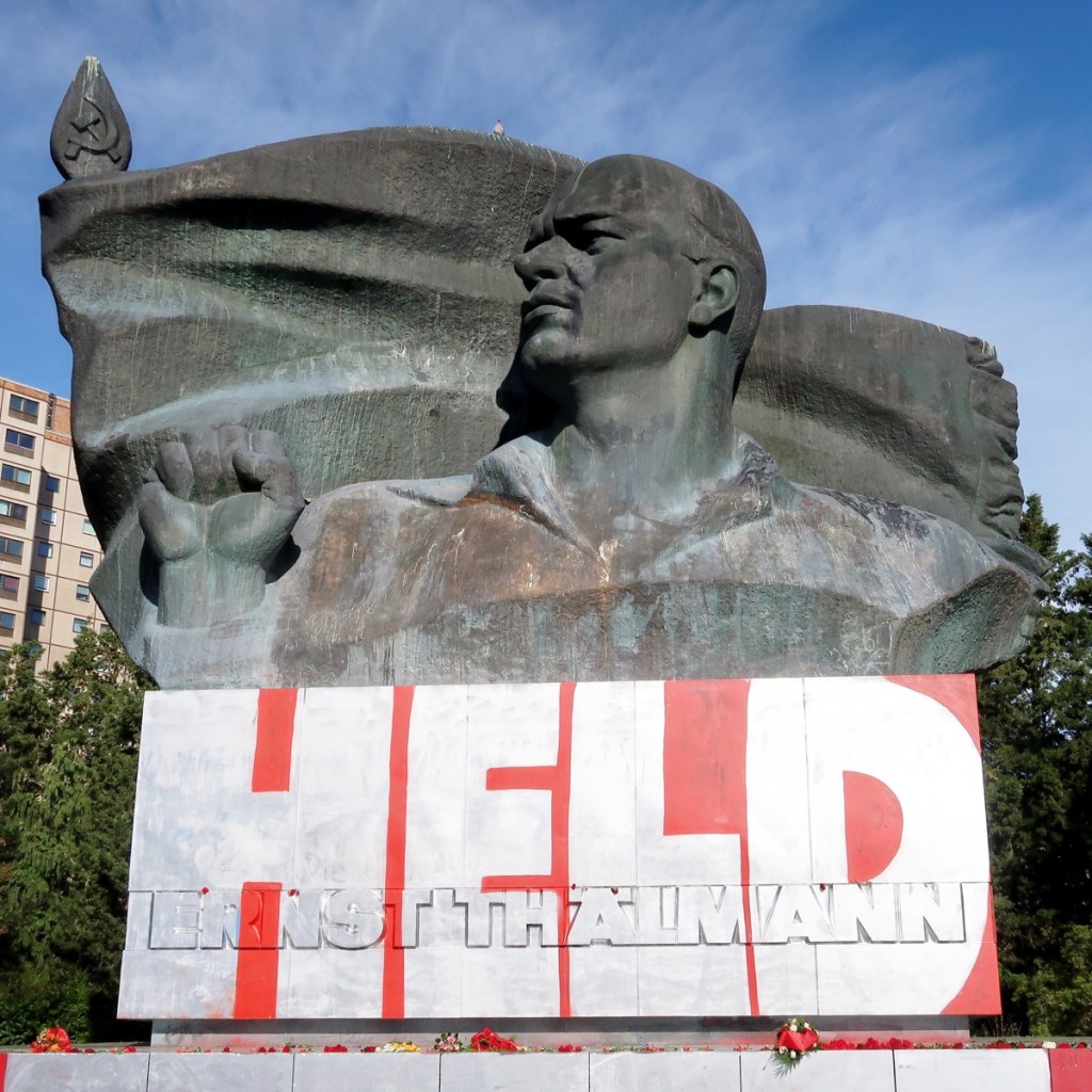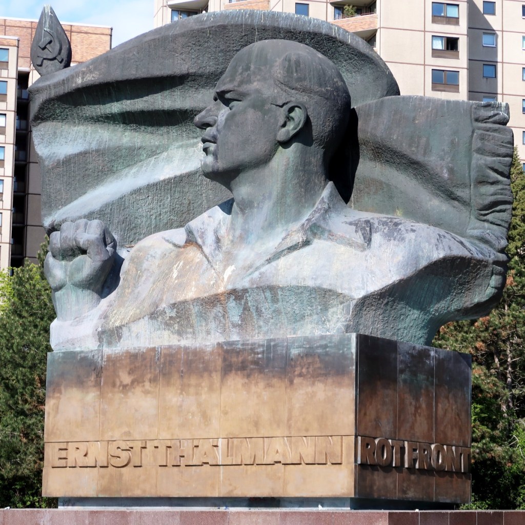 In den 1980er-Jahren legte man im Prenzlauer Berg den »Ernst-Thälmann-Park« an. Dazu errichtete man 1986 ein großes ERNST-THÄLMANN-DENKMAL des Bildhauers Lew Jefimowitsch Kerbel, eines gebürtigen Ukrainers. Der Thälmann-Kopf mit der Faust und der Fahne, die weht, als stehe der Sieg des Kommunismus unmittelbar bevor, ist kein Denkmal, das es uns einfach macht. Die riesige Bronzeskulptur ist und bleibt Projektionsfläche für Schmierereien und insbesondere für politische Botschaften. Kürzlich wurde