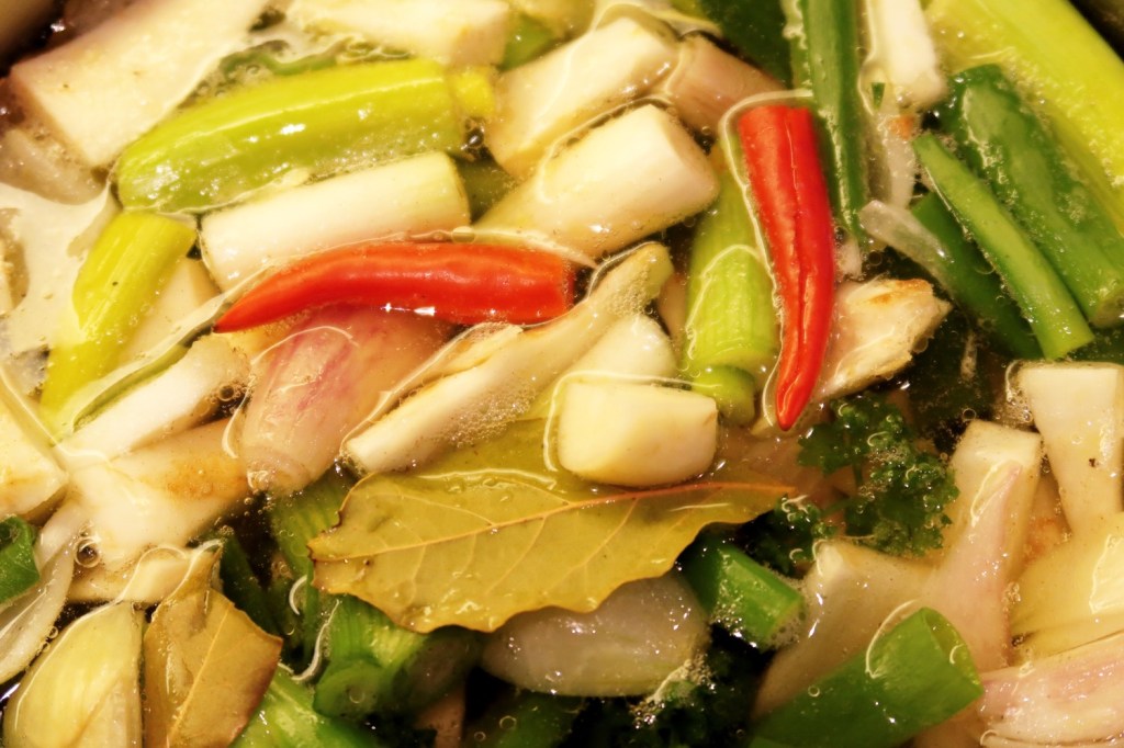 BRÜHE: jeweils mittelgroße Stücke von ›Suppengrün‹ (¼ Lauch, ¼ Sellerieknolle und 1–2 Möhren),