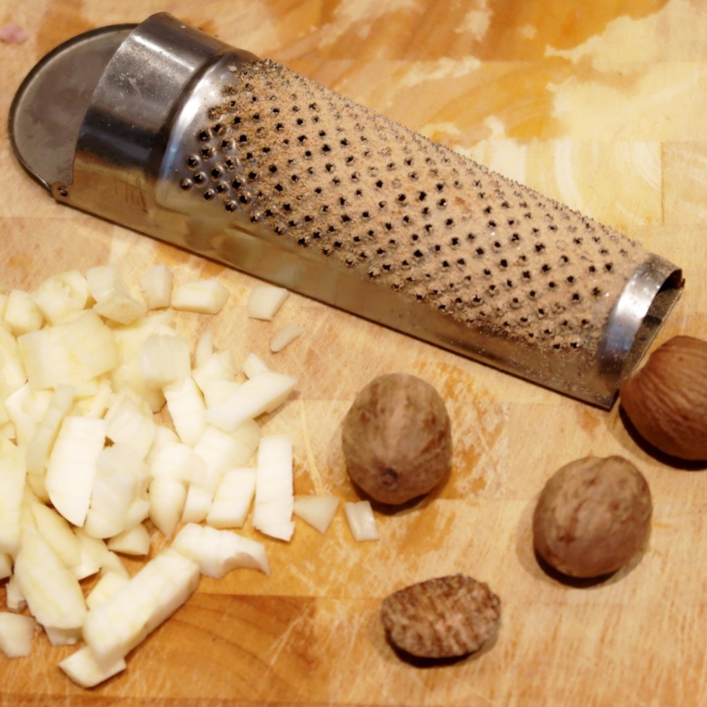 GEMÜSE: Das Gemüse abtropfen lassen, in eine Schmorpfanne geben. Mit Muskat und Pfeffer würzen (ggf. dann zusätzlich