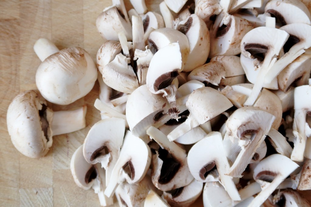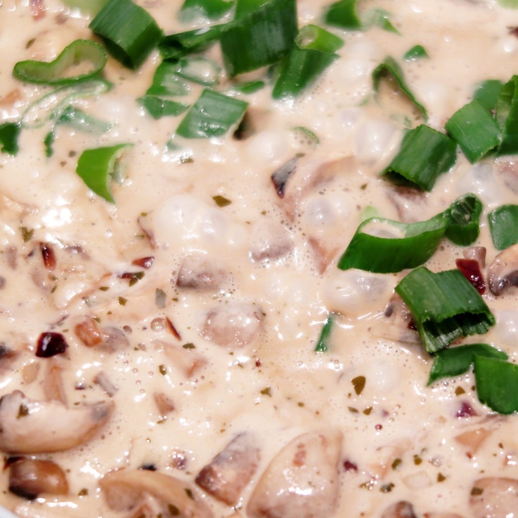 200 g Champignons in Bio-Qualität, 125 g Vollkornnudeln, 1 Lauchzwiebel, 1 kleine Rote Zwiebel, Knoblauch, Crème fraîche, Gemüsefond, Salz, Pfeffer geschrotet & als Körner, ggf. frische Kräuter, Liebe & Gefühl.