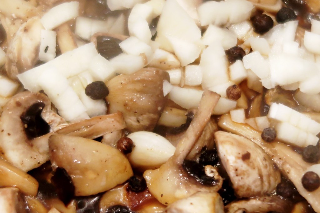 Säubern (Pilze mit Pinsel oder Bürste) und schnippeln, Nudeln im Gemüsefond kochen (10 MIN), Zwiebeln und Strunk von Lauchzwiebeln anbraten, Pilze dazu, Gemüsefond + Crème fraîche dazu, Pfefferkörner, Knoblauch und grüne Teile der Lauchzwiebel dazu, Nudeln in die Pfanne (spart Geschirr, nachhaltig). »Smaznego«!