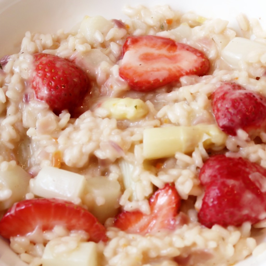 Den weißen Spargel schälen und in mundgerechte Stücke (Eßlöffelgroß) schneiden. In der Spargelbrühe (extra) miterhitzen, nicht kochen. Schalotten fein schneiden und anbraten. Wenn sie glasig gebraten sind, den Risottoreis einrühren. Nach dem Anschmoren sukzessive Brühe dazugeben. Rühren, rühren, rühren! Ggf. einen Schuss Weißwein dazugeben, nach 10 MIN den geriebenen Käse. Und ständig Brühe. Rühren, rühren, rühren! Nach 15 MIN würzen: Die Spargelbrühe und der Hartkäse sind gesalzen. Deshalb wenig salzen. Mit etwas Pfeffer würzen. Wenn der Reis ›SCHLOTZIG‹ ist, in den letzten Minuten vor dem Servieren die dazu gegebenen Erdbeeren und Spargelstücke kurz mit erhitzen.