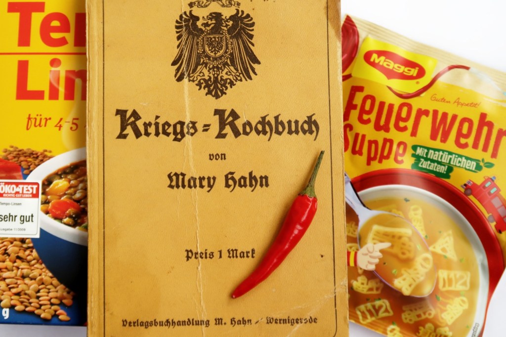 2. Akt: Das »Kriegs=Kochbuch« von MARY HAHN aus vergangenen (?) imperialistischen ›Kaiserszeiten‹ (1916. Neuauflage?).