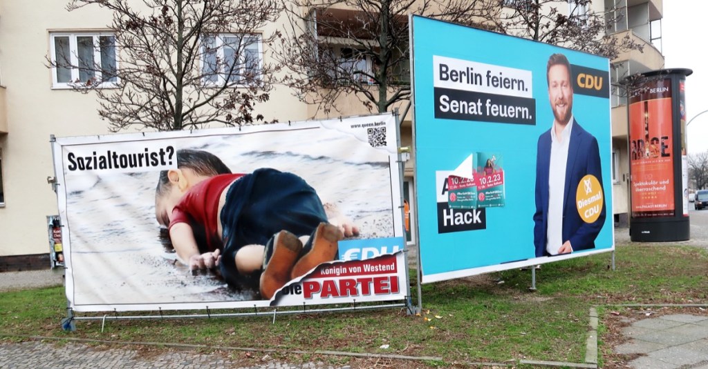 Die CDU gewann als erfolgreiche ›Protestpartei‹ die Wahl in Berlin: »Berlin ärgert sich schwarz«, titelte die »taz«. Schwere Niederlage: Die SPD konnte keinen einzigen Bezirk für sich entscheiden (Slogan »Weil sie es kann«). Die FDP flog mit 4,6 % aus dem Abgeordnetenhaus. Während die Außenbezirke ›SCHWARZ‹ wählten, dominierten im S-Bahn-Ring die GRÜNEN. Entschieden haben diese Wahlen die Ü70-Wähler:innen (›Generationengerechtigkeit‹). Rechnerisch würde es für eine Fortsetzung der Rot-Grün-Roten-Koalition (= 56 % der Sitze im Parlament) reichen. Kurz vor der Wahl hatte Kai Wegner, der Spitzenkandidat der CDU, jedoch eine Koalition mit den GRÜNEN kategorisch ausgeschlossen.