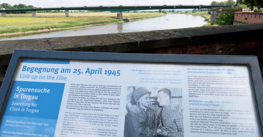 Beim »Schwur von Torgau«, gaben sich amerikanische und sowjetische Soldaten der Dienstränge das Versprechen, der Menschheit fortan Kriege zu ersparen. Dieser Schwur missfiel schon bald den Mächtigen. Einer der damals am Treffen teilnehmenden US-Soldaten, Dolmetscher Joseph ›Joe‹ Polowsky, setzte sich in der Zeit des 1. Kalten Krieges unermüdlich für die Anerkennung des 25. April als »Weltfriedenstag« ein. Gemäß seinem letzten Willen erhielt er 1983 die letzte Ruhestätte auf dem evangelischen Friedhof in Torgau.