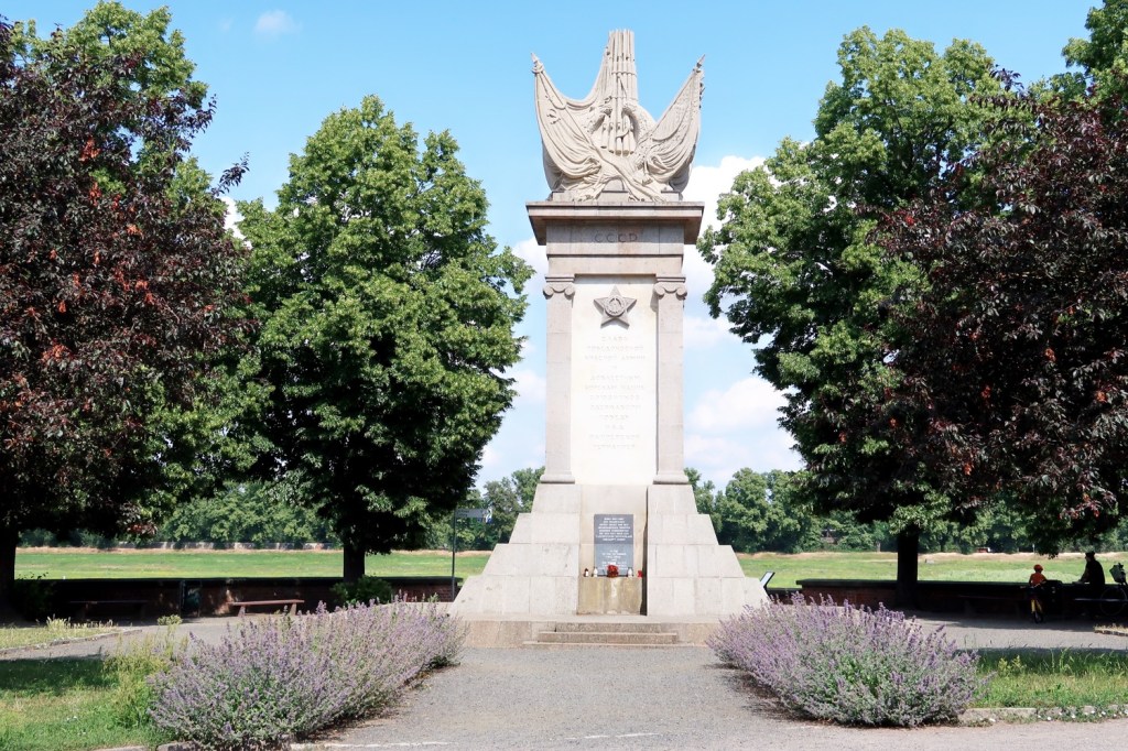 Fahnenmonument in Sandstein am Begegnungsort von sowjetischen und amerikanischen Truppen am 25. April 1945 beim alten Brückenkopf der Elbbrücke. AVRAAM MILETZKIJ, Hauptmann der Sowjetarmee (Pioniere) und Architekt, schuf es. Zu seiner aus Kiew stammenden Familie jüdischen Glaubens, gehörten etwa 70 Mitglieder. Nur ein Onkel und er selbst hatten den Zweiten Weltkrieg überlebt. Das Denkmal sollte ursprünglich mit einem Panzer oder einem schweren Artilleriegeschütz gekrönt werden, doch Miletzkij hielt eine andere gestalterische Aussage für wichtiger: »In Torgau haben die Waffen geschwiegen.« Die Bekrönung des im September 1945 fertiggestellten Monuments zeigt die Fahnen der Sowjetunion und der Vereinigten Staaten von Amerika.