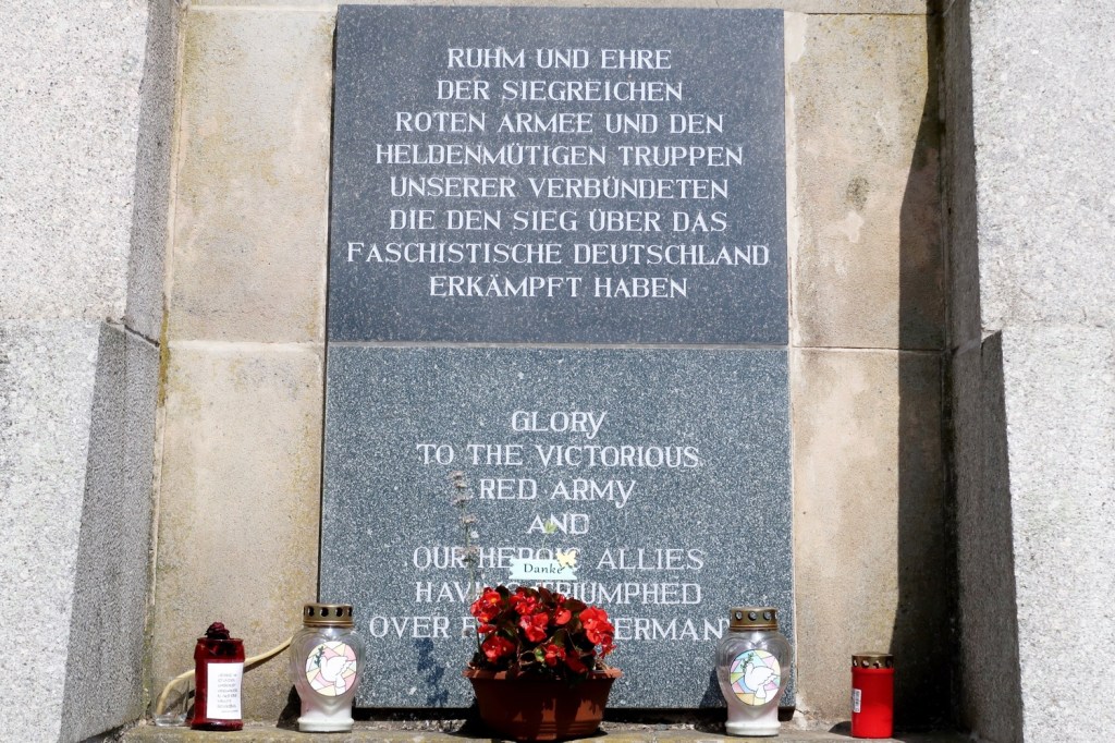 Die Tafeln im Unterbau mit der Übersetzung der russischen Inschrift ins Deutsche und Englische wurden nachträglich angebracht.