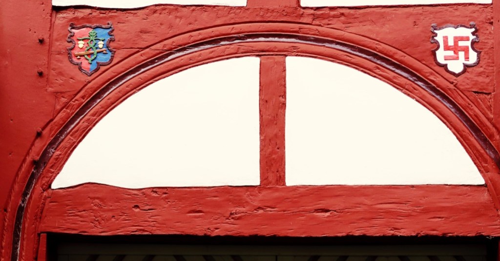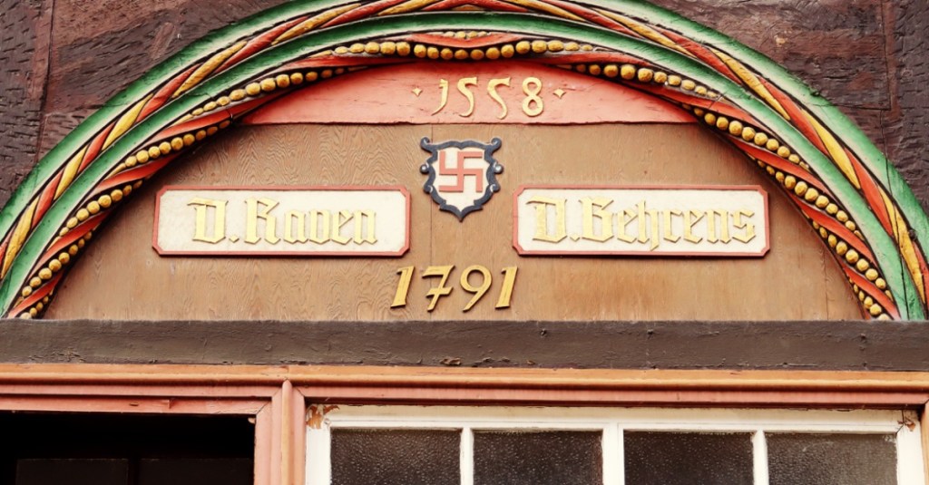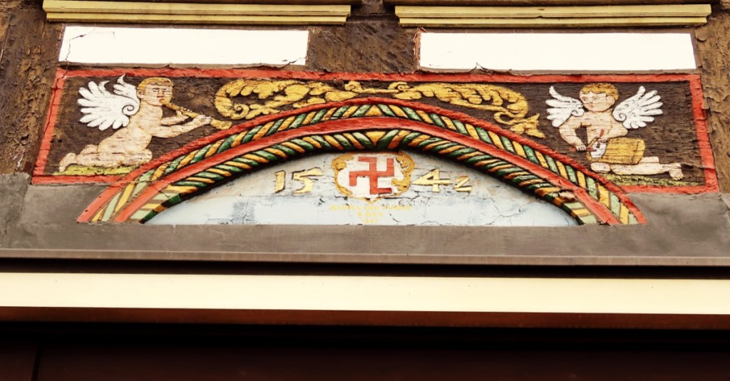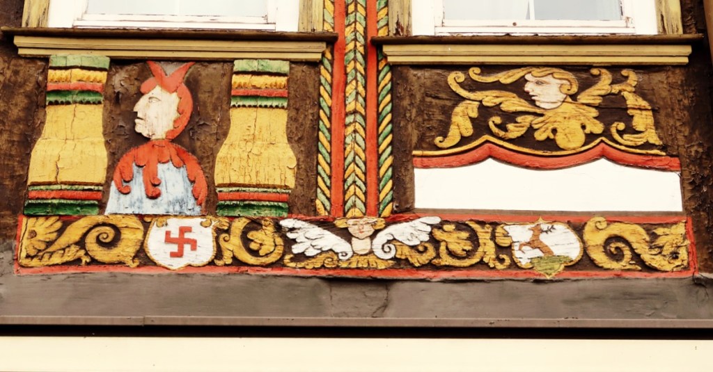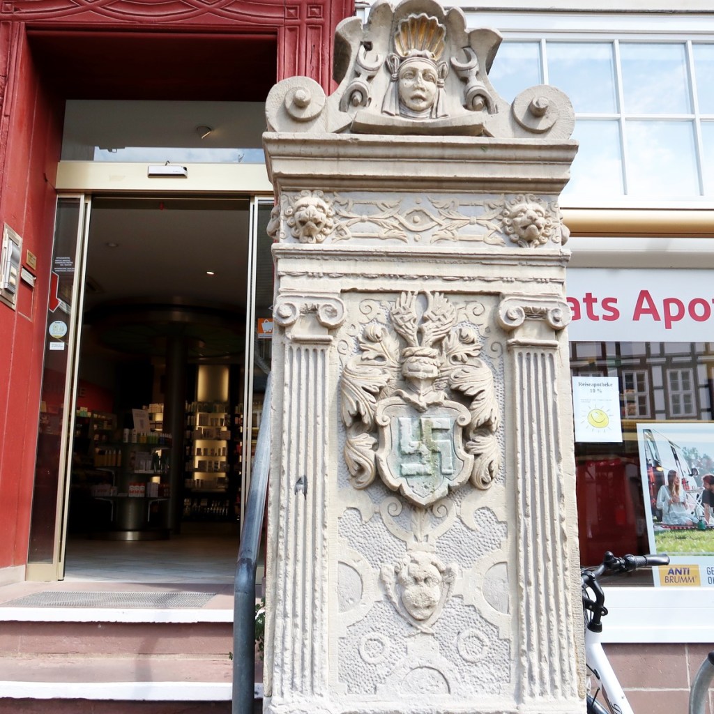 des Familienwappens sichtbar. Teil ihres Familienwappens ist die SWASTIKA (umgangssprachlich das ›Hakenkreuz‹). Ein indisches Glückssymbol in Form eines Sonnenrades. Diese Familie besaß neben der Rats-Apotheke noch weiteren Grundbesitz in Einbeck,