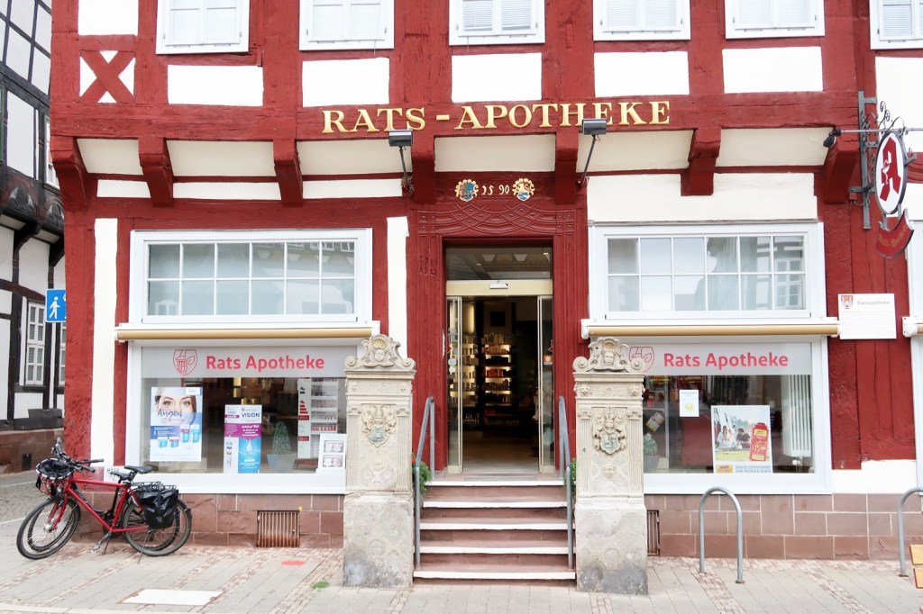 Die Rats-Apotheke am Marktplatz, ein Fachwerkgebäude aus dem Jahr 1590. Das Gebäude gehörte im 16. Jahrhundert der reichen Patrizierfamilie RAVEN. Auf dem Wangenstein rechts von der Eingangstreppe sowie am Haus sind noch heute Abbildungen
