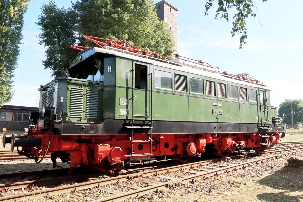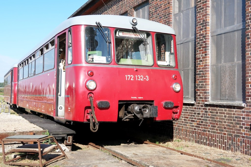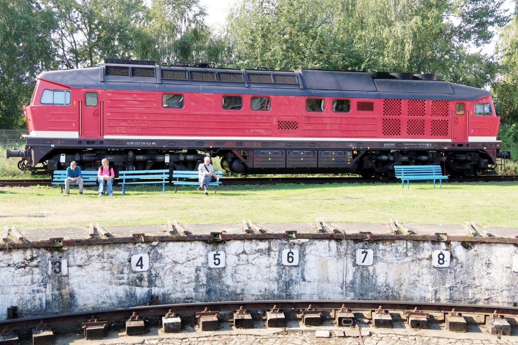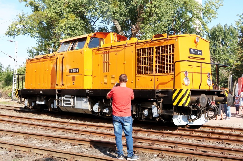 Zwei Bahnaktionstage in LUTHERSTADT WITTENBERG (Sachsen-Anhalt). Die Ausstellung historischer und moderner Fahrzeuge, Führerstandsmitfahrten sowie der Modellbahn- und Souvenirverkauf lockten zahlreiche ›Pufferküsser‹ ins Bahnbetriebswerk (BW). Ich war sonntags da (17.09.). Allein unter Pufferküssern. Zwischen dem Hauptbahnhof Lutherstadt Wittenberg und dem BW pendelte stündlich ein historischer Triebwagen (›Ferkeltaxi‹) der Deutschen Reichsbahn (DR).