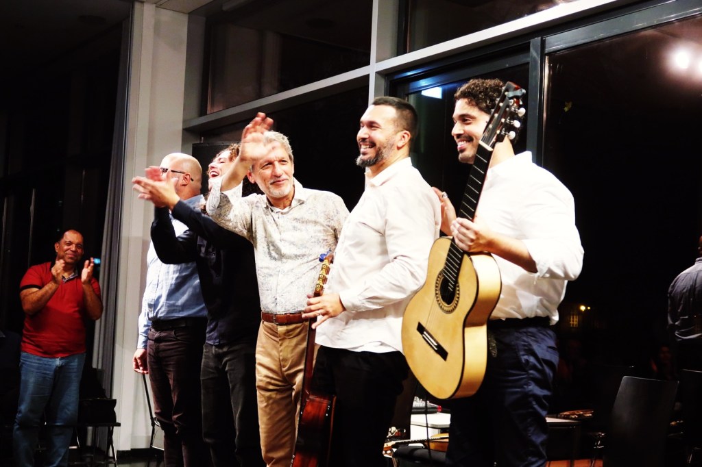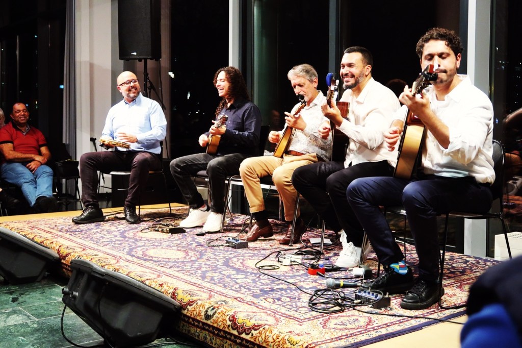 Die Gruppe (von links), bestehend aus Valério Xavier (Pandeiro), Márcio Marinho (Cavaquinho), RECO DO BANDOLIM (Mandoline), George Costa (6-saitige Gitarre) und Henrique Neto (7-saitige Gitarre), lud das Publikum zu einer Reise durch die Geschichte und die Rhythmen Brasiliens ein, mit Interpretationen, die sich durch Authentizität und die ansteckende Freude des Choro auszeichnen.