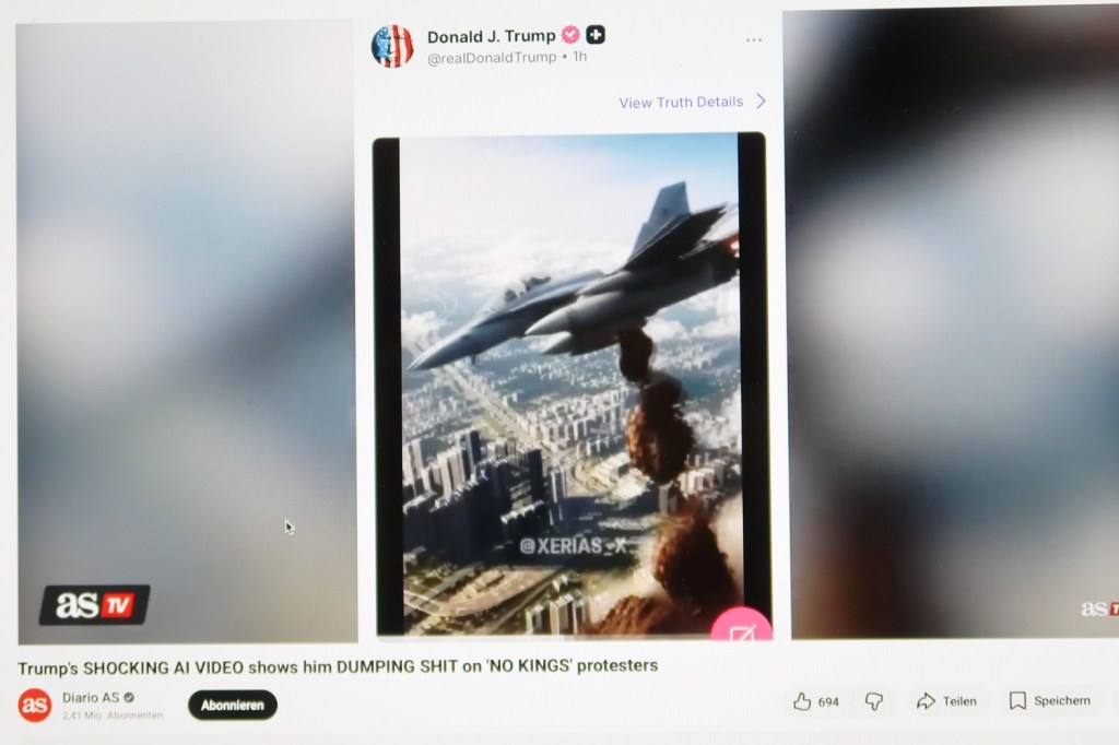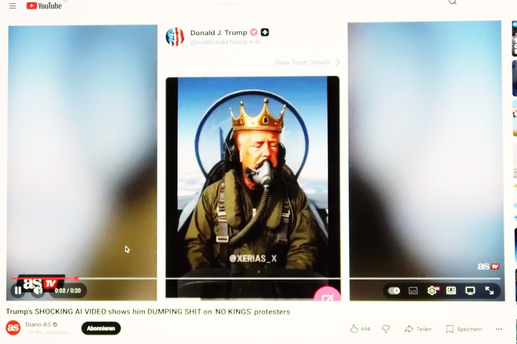Der König und Friedensengel Donald Trump ließ aus seinem Kampfjet im »Shutdown« Manna auf seine Untertanen regnen. Er erstellte hierzu ein KI-generiertes Fäkalien-Video. Das verbreitete er über sein »soziales Netzwerk Truth Social« (20.10.). Trumps frommer Wählerschaft gefällt das.
