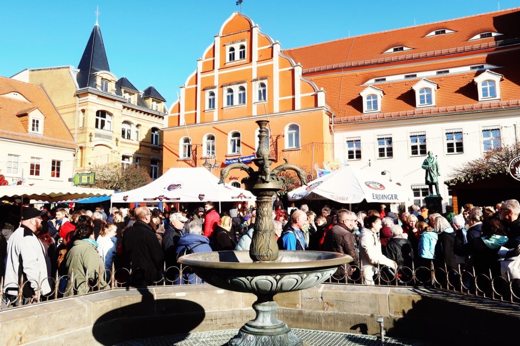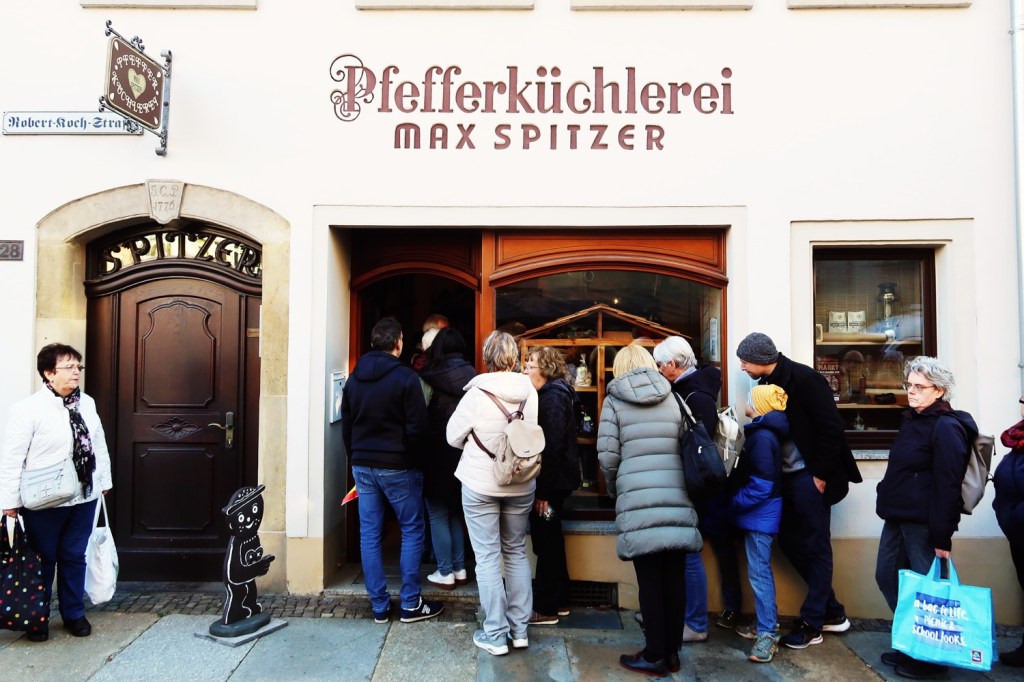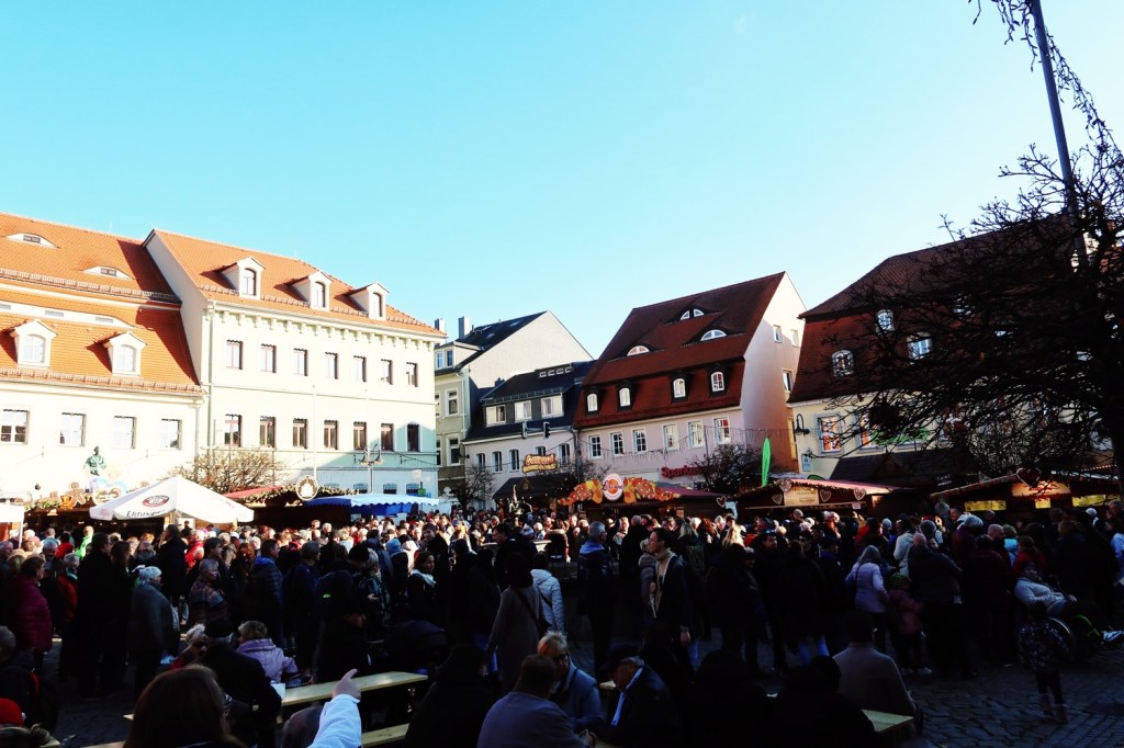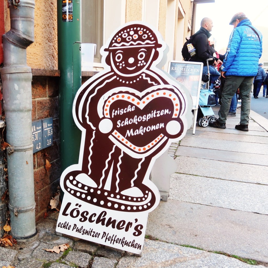 In der gesamten Altstadt waren Stände mit − Achtung ›sächsisch‹ − Gunstgewerbe und Spezialitäten aufgebaut (08.11.). Beispielsweise mit FETTBEMMCHEN. Am Marktplatz waren alle neun örtlichen Pfefferküchlereien vertreten. Davor Schlangen. Ich reihte mich in der kürzeste ein (»Keine Kartenzahlung möglich«). Walnuss-Pfefferkuchen, Haselnuss-Pfefferkuchen, Gewürzpfefferkuchen, ungefüllte rechteckige Pfefferkuchen mit Zartbitter-Schokolade überzogen und mit Mandeln belegt, Lebkuchenmänner. Lecker, lecker, lecker. Aber auch vor den Stammhäusern der Pfefferküchlereien: lange Schlangen. Vieles steht im Zeichen des Pfefferkuchens: Pfefferkuchenbier, Pfefferkuchensenf, Pfefferkuchen-Klopse, Pfefferkuchen-Leberwurst und PFEFFERKUCHEN-BRATWURST (Bild). Die Eingeborenen sind sehr freundlich und hilfsbereit, nu. Sehr gut beraten wurde ich in der Metzgerei Dürrröhrsdorfer. Interessant war der Besuch des Pfefferkuchen-Museums.