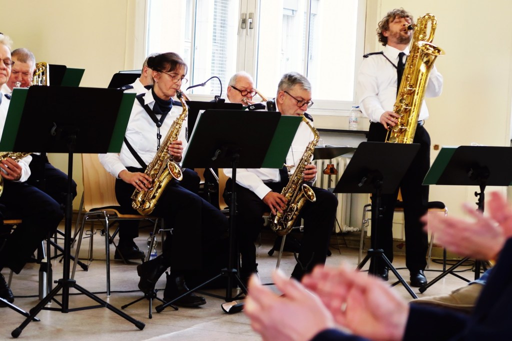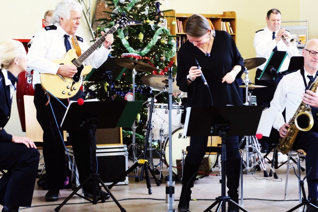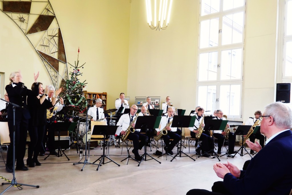 Weihnachtskonzert der ZOLLKAPELLE im Casino des Hauptzollamtes (HZA/ 10.12.). Big-Band-Sound vom Feinsten; interpretiert von neunzehn Musiker:innen: vier Trompeten, fünf Posaunen − darunter eine Bass-Posaune, fünf Saxophone (Tenor-, Alt- und Bariton), E-Gitarre, Bass, Schlagzeug, Percussion und eine Jazzsängerin. Als Zugabe erklang die »Petersburger Schlittenfahrt«.