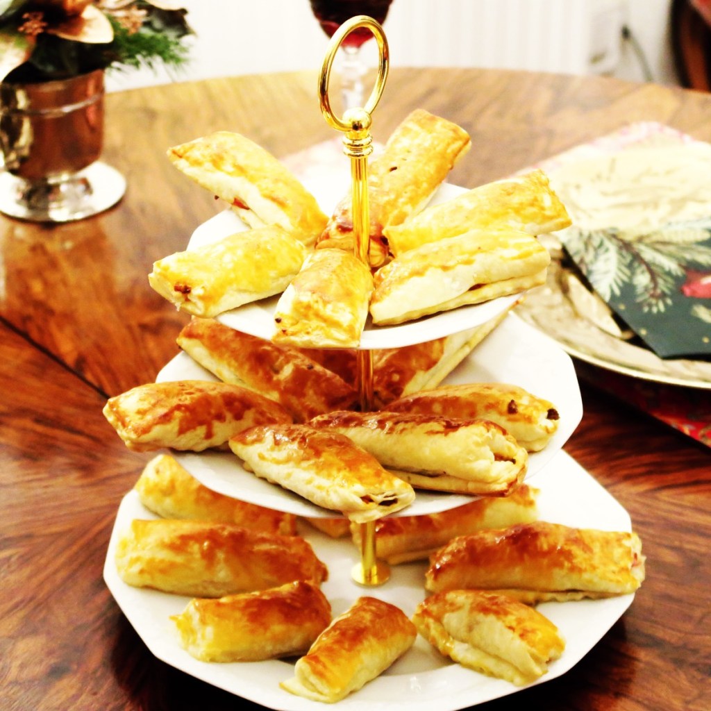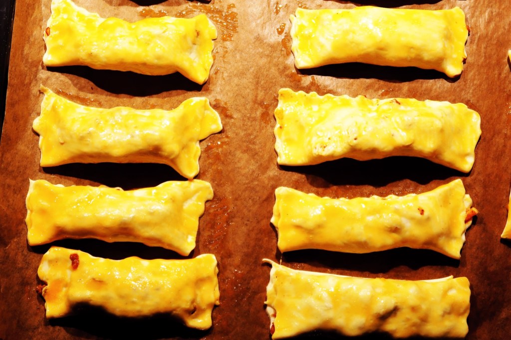 SCHINKEN TEIGTASCHEN Die Schinkenwürfel in die Blätterteigteilchen einrollen.