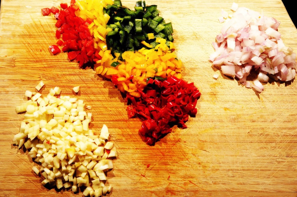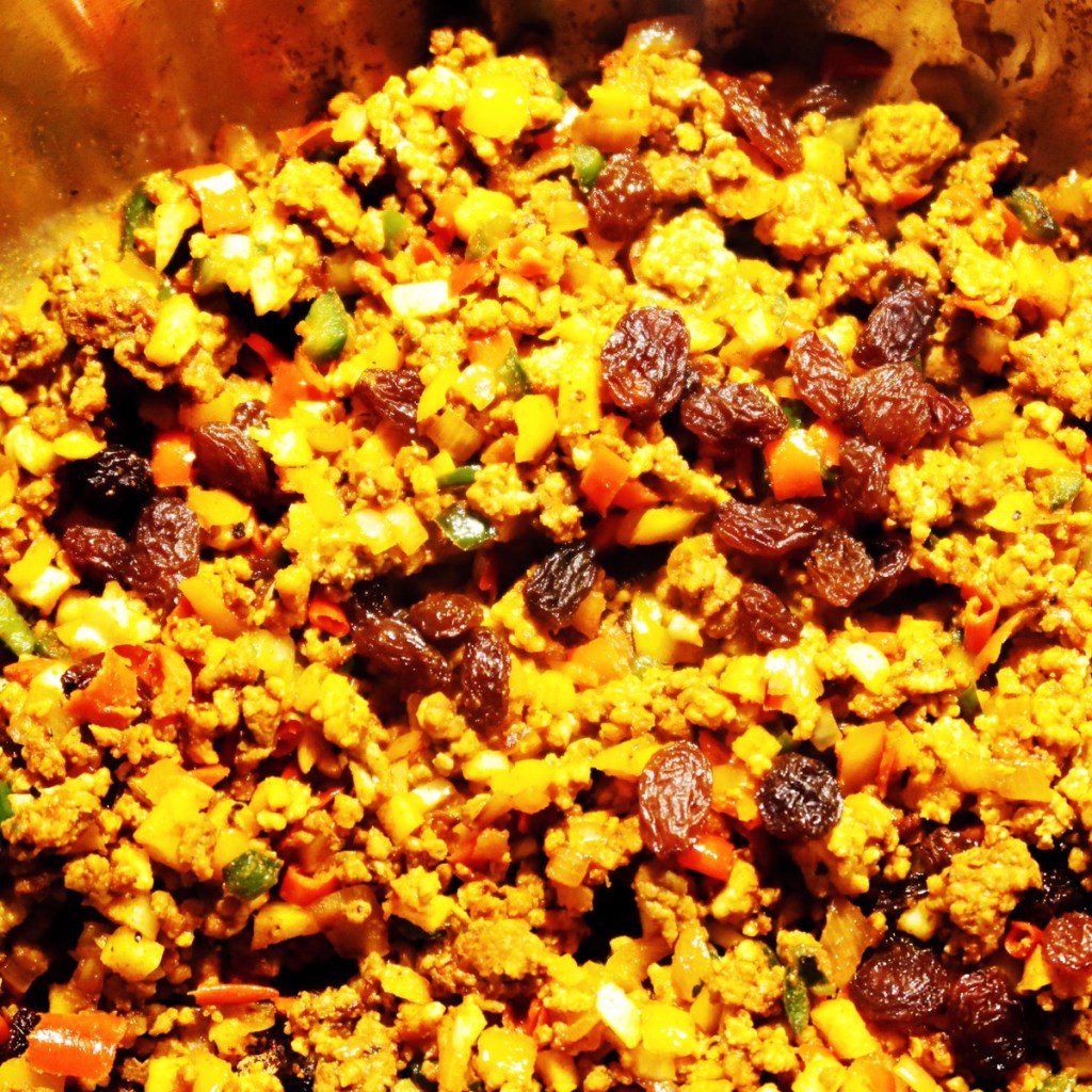 Die Chilischoten waschen und entkernen. Schalotte, Knoblauchzehen und Chilischoten klein schneiden. Das Hackfleisch anbraten, salzen, pfeffern. Schalotten dazugeben. Mit Rosenpaprika (scharf) gut würzen. Sukzessive die Schoten und den Knoblauch dazu. Mit ›Paprika edelsüß‹ würzen. Kurz vor dem Garwerden die Rosinen und kleingeschnittenen gekochten Eier in die Füllung.
