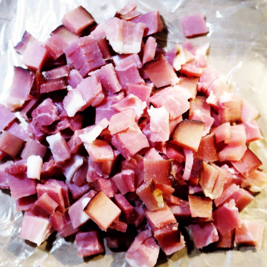 Ggf. zusammen mit einem milden geriebenen Bergkäse (z. B. Appenzeller, Raclette) – das probiere ich noch aus. Dann müsste man aber die Zutatenmenge reduzieren: 125 g Schinkenwürfel; 125 g Käse.
