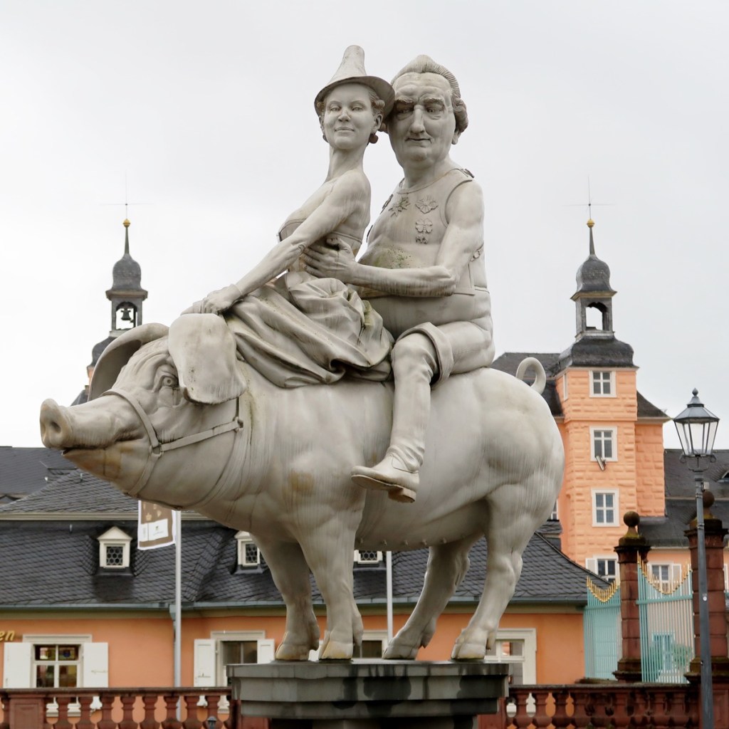 Auf dem Schlossplatz steht seit 2016 die Skulptur GLÜCKSSCHWEIN von Peter Lenk. Sie zeigt den leichtbekleideten Kurfürsten Carl Theodor mit einer Mätresse auf einer Sau reitend. Lenk bezieht sich auf ein Zitat des Preußenkönigs Friedrichs des Großen. Der Legende nach soll Friedrich II. Carl Theodor »als einen faulen Kerl und Glücksschwein, das mehr Länder geerbt, als er selbst erobert« bezeichnet haben.