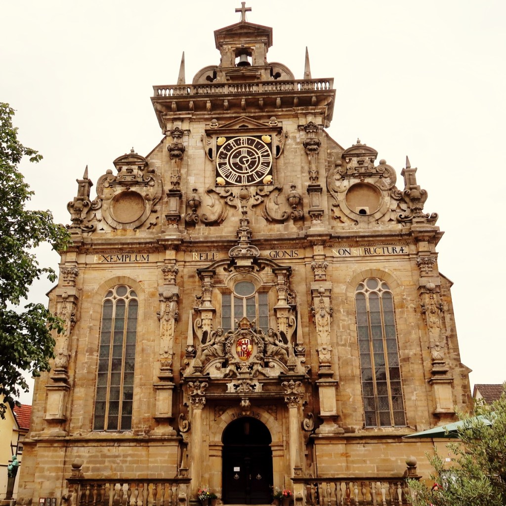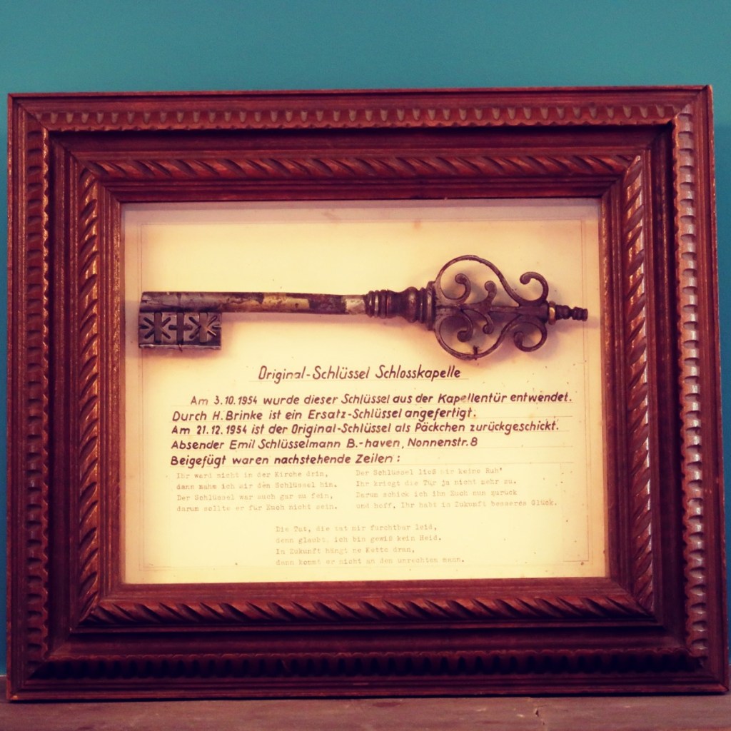 Donatus ›Erbprinz zu Schaumburg-Lippe‹, Alexander ›Fürst zu Schaumburg-Lippe‹ und Mahkameh ›Fürstin zu Schaumburg-Lippe‹ (von links).Den Schlüssel für das Schloss zur Kapelle ließ in den 1950er-Jahren ein Besucher ›mitgehen‹. Später schickte er ihn reumütig mit diesem Begleitschreiben zurück. Unter den mit Sternen gekennzeichneten Bodenplatten sind die Herzen Verstorbener bestattet. Das Glockenspiel am Rathaus spielte »Ännchen von Tharau«. Brunnenfigur in der Fußgängerzone. Die Bückeburger Stadtkirche. 1611 wurde mit dem Bau begonnen, der 1615 abgeschlossen war. Das Gotteshaus gilt als der bedeutendste Kirchenbau des frühen Protestantismus in Norddeutschland. Graf Ernst wollte mit dem Bau ein Exempel bieten, daher ließ er über der Fassade die Inschrift EXEMPLUM RELIGIONIS NON STRUCTURAE (»Beispiel der Frömmigkeit, nicht der Baukunst«) anbringen, deren Anfangsbuchstaben seinen Namen ergeben. Bekanntester Prediger an der Kirche war Johann Gottfried HERDER.