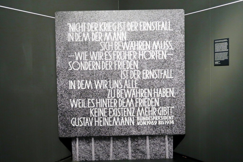 »Ich sehe als erstes die Verpflichtung, dem Frieden zu dienen. Nicht der Krieg ist der Ernstfall, in dem der Mann sich zu bewähren habe, wie meine Generation in der kaiserlichen Zeit auf den Schulbänken lernte, sondern der Frieden ist der Ernstfall, in dem wir alle uns zu bewähren haben. Hinter dem Frieden gibt es keine Existenz mehr.« GUSTAV HEINEMANN (1899–1976), Sozialdemokrat (Quelle: Ansprache nach Leistung des Amtseids als Bundespräsident in der gemeinsamen Sitzung von Bundestag und Bundesrat am 1. Juli 1969). Im Zentrum des Ludwigshafener Friedensparks steht ein Gedenkstein mit folgendem (abgewandelten) Zitat des ehemaligen Bundespräsidenten: »Nicht der Krieg ist der Ernstfall, in dem man sich bewähren muss – wie wir es früher hörten –, sondern der Frieden ist der Ernstfall, in dem wir uns alle zu bewähren haben, weil es hinter dem Frieden keine Existenz mehr gibt!«