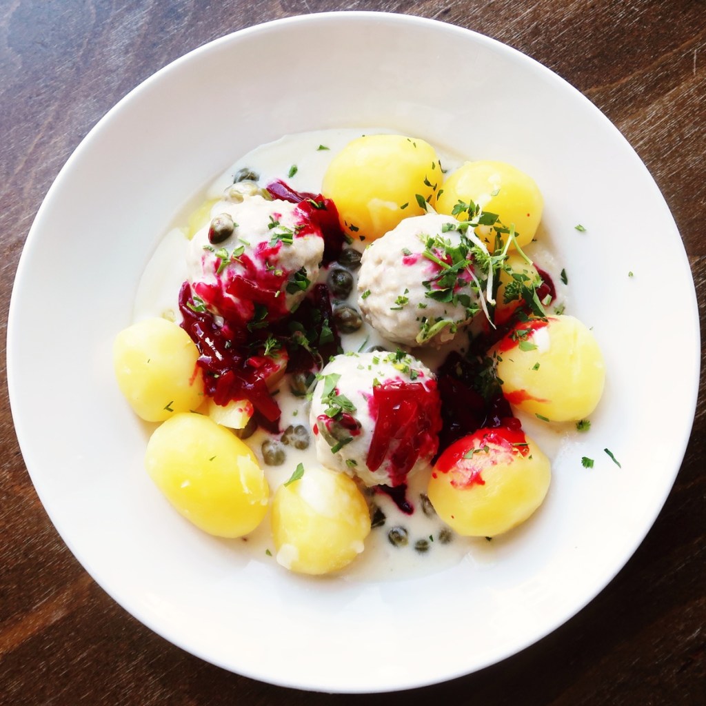 Salzkartoffeln, die fast in der Sauce ertrinken, bilden die klassische Beilage. Man isst tatsächlich mit Löffel und Gabel – die Kartoffeln damit in der Sauce zu zerdrücken, ist bei diesem Gericht ausdrücklich erlaubt! Zu den Klopsen passen aber auch hervorragend Kartoffelpüree oder Reis. Und Rote Bete.