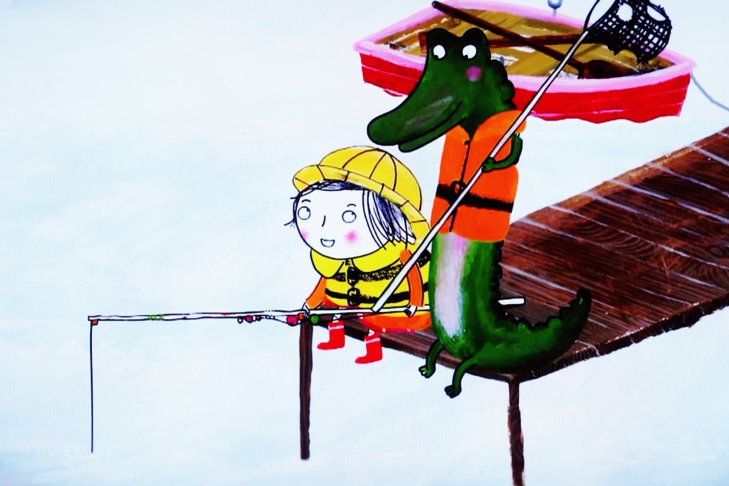 Am vergangenen Mittwoch (19.03.) brachte unser Sandmännchen eine neue Geschichte von Rita und ihrem Krokodil mit: Rita und das Krokodil bei einem gemeinsamen Angelausflug. Rita brachte dem Krokodil das Angeln bei. Während Rita die neueste Angel- ausrüstung besaß, konnte das Krokodil nur einen alten kaputten Kescher benutzen. Und das Krokodil fing alle Fische! Daraufhin tauschte Rita frustriert das Fanggerät, zunächst erfolglos. Doch schließlich fing sie den größten Fisch. Abends gab es natürlich Fisch zum Essen: Ritas Riesenfisch und die vielen gefangenen Wassertiere vom Krokodil. Seufz.