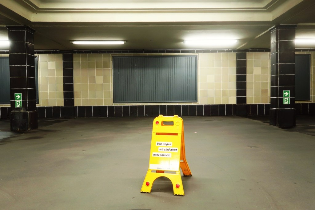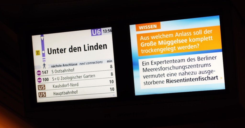 Unterwegs auf der Berliner U-Bahn-Linie 6 (01.04.). Im ›Berliner Fenster‹ die Tagesmeldung »Nahezu ausgestorbene Riesen- tintenfisch-Art in der Müggelspree«. Der Brauch, Mitmenschen in den April zu schicken, verschwindet. Was einst als Schabernack gedacht war, ist heute böswilliger Manipulation gewichen. Heute überschwemmen uns täglich Falschmeldungen (Fake-News). Unterirdisch: Sauberzitty!
