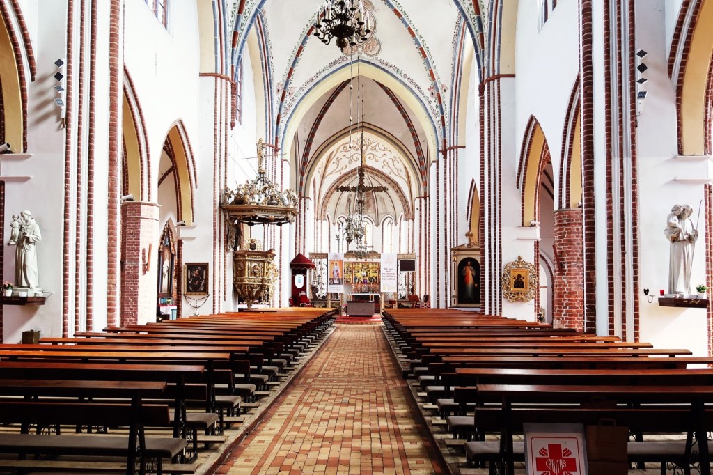 Das spätgotische Rathaus auf dem Marktplatz wurde Mitte des 14. Jahrhunderts erbaut und nach dem Zweiten Weltkrieg wieder errichtet. Da sind die Pol:innen Meister:innen! Ich ziehe meinen Hut. Die Deutschen hätten nach dem Krieg in den Städten mehr- spurige Stadtautobahnen mit Tank- und Raststätten gebaut. Die Pläne der deutschen Stadtplaner lagen bereits in den Schubladen. Die hatten damals die Bombardierungen der Alliierten begrüßt. Das gehört zur Wahrheit, unbedingt. Die Kathedrale St. Johannes wurde 1175 begonnen und 1385 vollendet. Bekannt ist die gut erhaltene und wohlklingende Orgel. Das Orgelgehäuse von 1669 stammt von Michael Birgel. Eine Pforte führt vom nördlichen Seitenschiff in den einzigen in Pommern teilweise erhaltenen gotischen Kreuzgang. Cammin blieb bis 1810 Bischofssitz. Die Kirche war geschlossen. Durch die Scheibe der Eingangstür fotografiert.