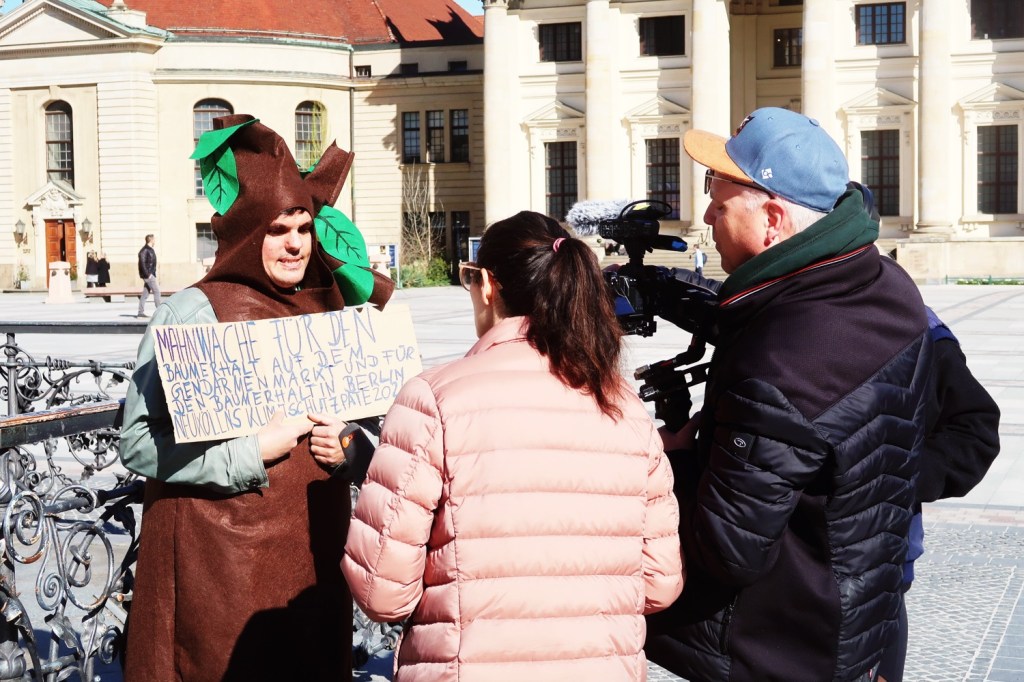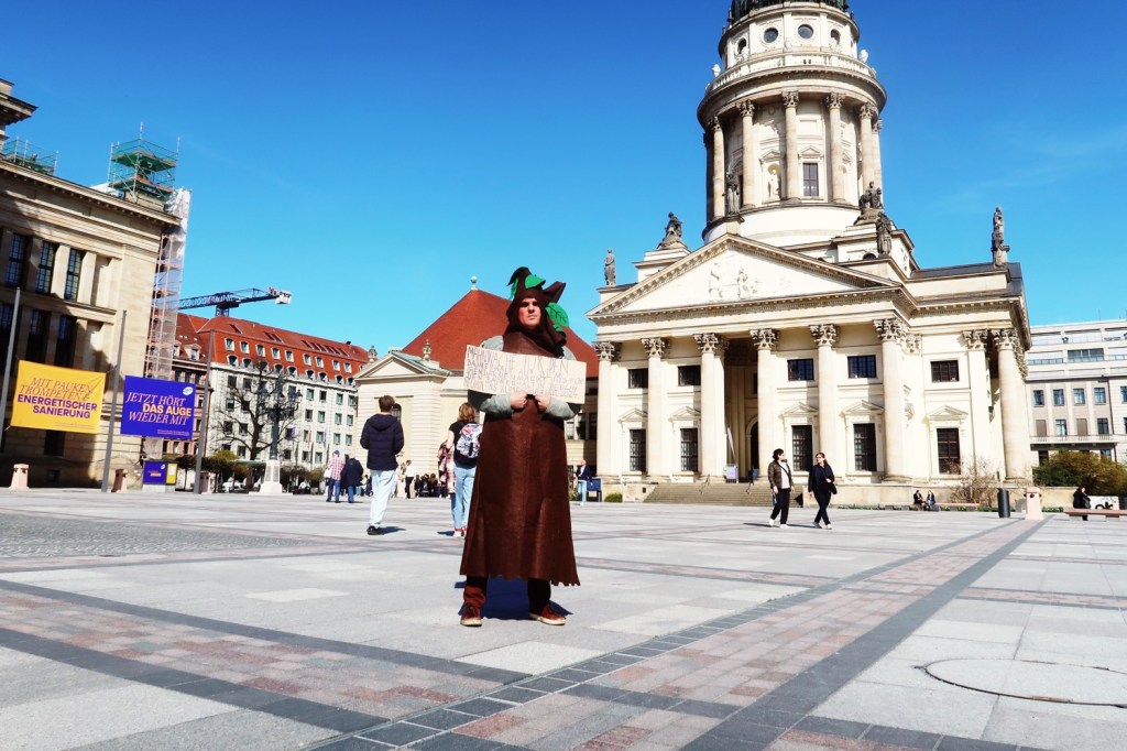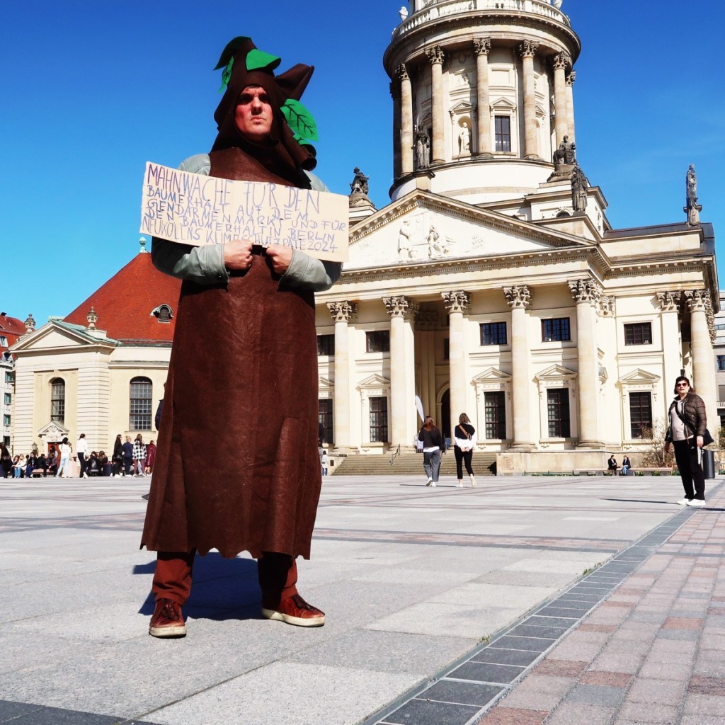 Keine Bäume auf dem Berliner Gendarmenmarkt? Von wegen. Direkt vor dem Schiller-Denkmal steht einer. Allerdings nur einmal wöchentlich donnerstags in der Zeit von 10:00 bis 12:00 Uhr. Der Klimaaktivist SEBASTIAN HERGES protestiert jede Woche im Baumkostüm auf dem Gendarmenmarkt. Er selbst hat sich in Berlin schon vor seiner Identität als Baum einen Namen gemacht: Er ist Neuköllner Klimaschutzpate und manchen als ›BerlinerBäumeWässerer‹ bekannt, der Anwohner der Hufeisensiedlung zum gemeinsamen Bäumegießen aufruft. Beim Halbmarathon am 6. April will Herges wieder, wie in den vergangenen Jahren, eine grüne Gießkanne mit sich führen − aber nicht nur: Denn er wird in diesem Jahr den Lauf auch erstmals im Baumkostüm absolvieren.