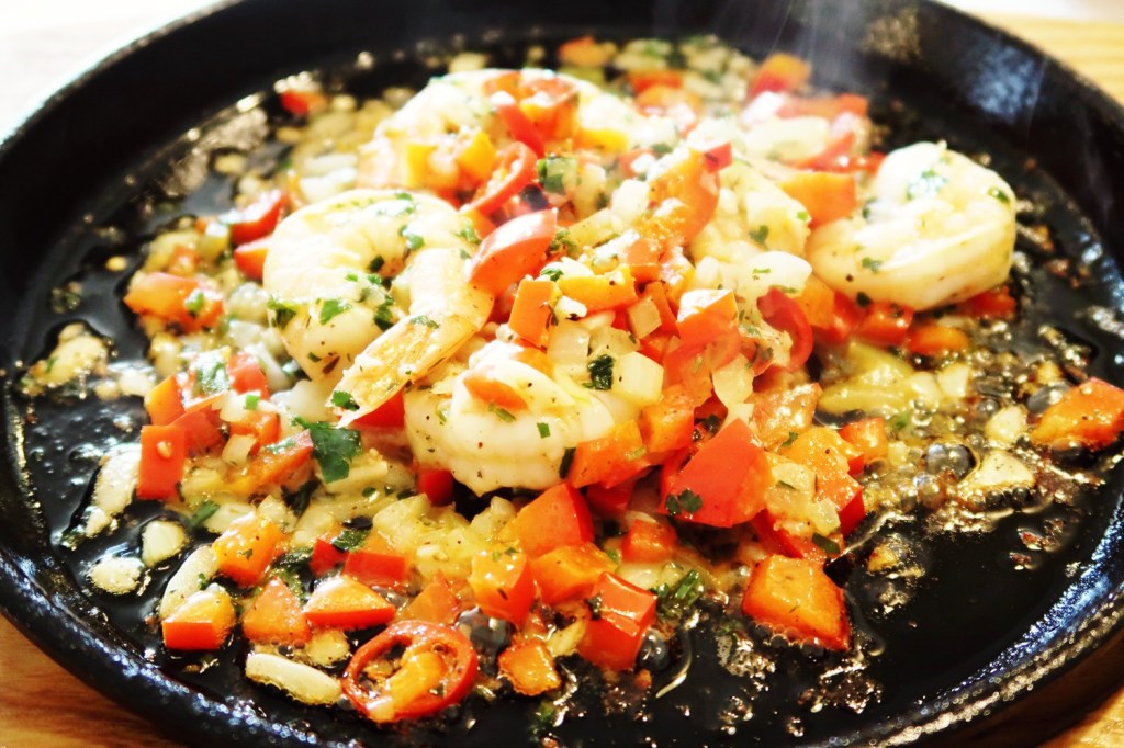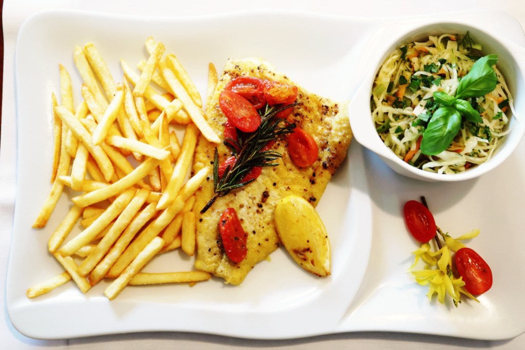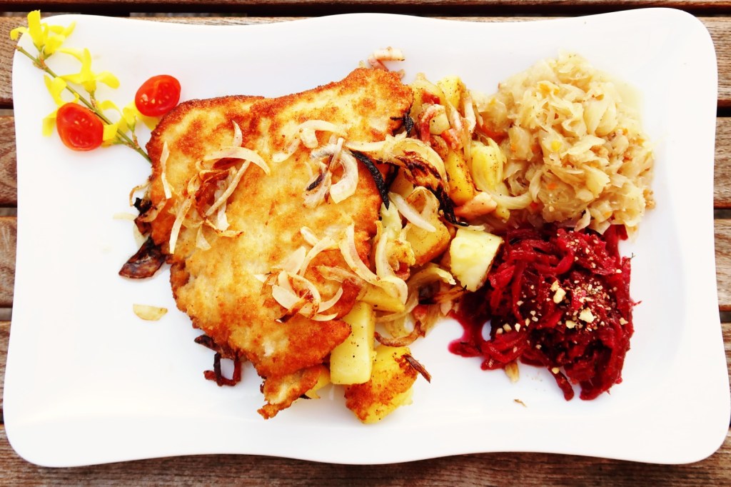 Hering auf polnische Art. Königsgarnelen. Fischsuppe, stets pikant. Dorsch gab es in verschiedenen Varianten. Kotlet po polsku. Auf Bratkartoffeln, mit geschmortem Kraut und Rote-Bete-Salat. Blaubeer-Pfannekuchen an Vanilleeis.