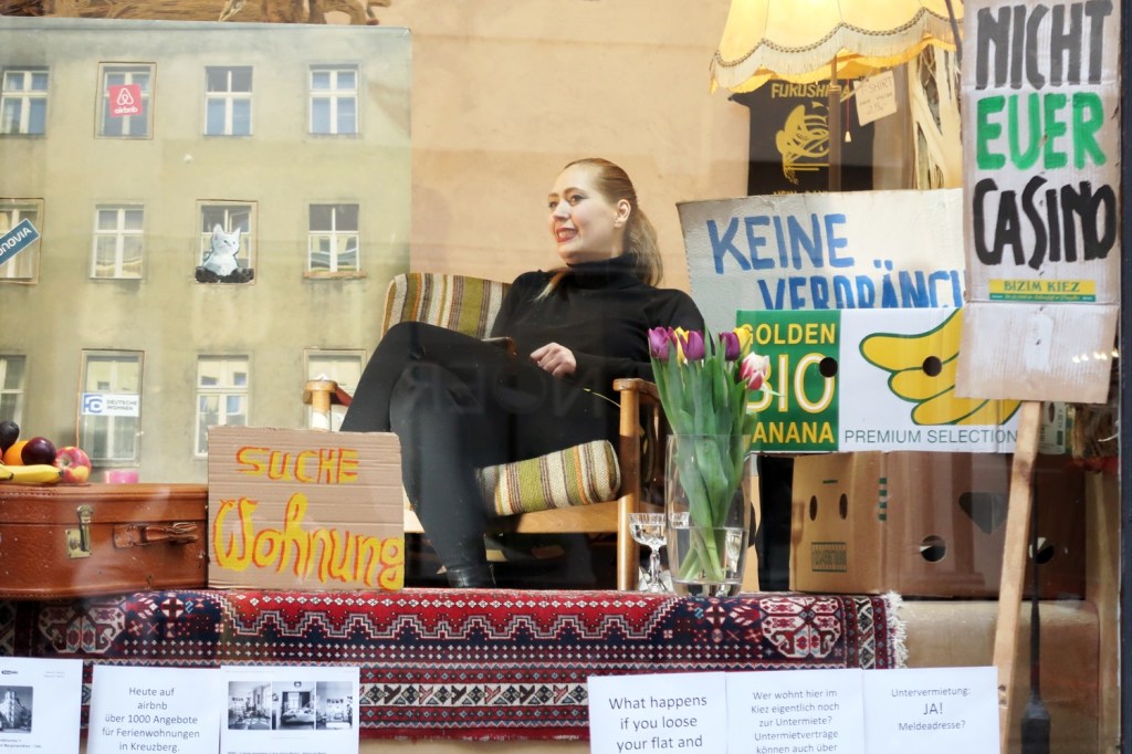 Im Kreuzberger Wrangelkiez machte eine Frau als lebende Suchanzeige auf die Wohnungsnot in der deutschen Hauptstadt aufmerksam. Seit vergangener Woche saß die Künstlerin Joana V. im Schaufenster der Galerie Heba – ihr war wohl fristlos gekündigt worden (13.04.). Im Rahmen der mehrtägigen Kunstperformance nahm die Betroffene werktäglich zwischen 12:00 und 20:00 Uhr in dem Schaufenster an der Falckensteinstraße Platz. Bezahlbaren Wohnungsraum gibt es nicht mehr. Von der Politik genauso gewollt. Die Politik der vergangenen 25 Jahre trägt endlich Früchte. Berlin ist inzwischen die zweitteuerste Stadt nach München. Und damit nicht mehr sexy. Das ist die Berliner Luft!