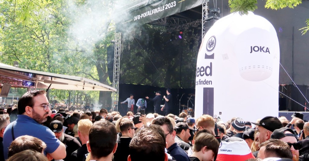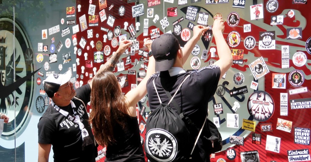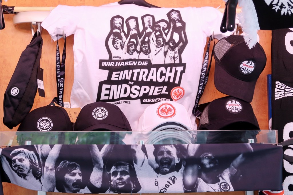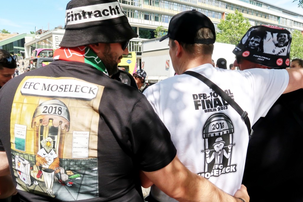 Erinnerung an den Adlerträger UWE BEIN? Säule der Eintracht in der Zeit von 1989 bis 1994. Am Schaufenster des nahegelegenen Nike-Shops überklebten Frankfurter das Leipzig-Logo. Diehessesinsowunnerbar EINTRÄSCHTISCH. ZAUBERTRANK. Im Stadion dürften 50.000 Frankfurt-Anhänger gewesen sein, da sind die Frankfurter Fans findig; 75.000 passen ins Berliner Olympiastadion. Neunmal gelangten die Frankfurter ins Pokalfinale, fünfmal gewannen sie den Pokal. IHR WISST BESCHEID: 1974, 1975, 1981, 1988 und 2018.