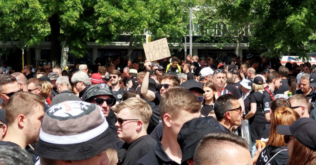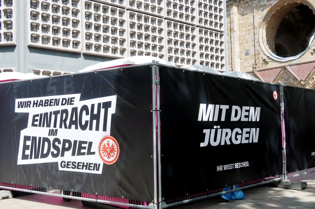 Bereits um 14:00 Uhr war beim Fan-Treff der Frankfurter am Breitscheidplatz der Teufel los. Bis zum Nachmittag sollen sich dort 20.000 Fans versammelt haben. Überall in der Stadt hörte man Hessisch-Gebabbel. Erbarmen zu spät!