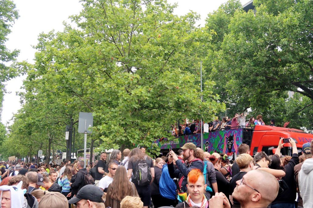 »Rave the Planet«; heraus aus der MOTTE(n)-KISTE (09.07.): mehr als 200.000 Raver:innen feierten über Stunden und tanzten an der Seite von 18 Musikwagen. Der Zug, bestehend aus den FLOATS und den Raver:innen, bewegte sich nur langsam voran. Wummernde Boxen, elektronische Sounds – es war laut und voll. Nach dem Rave sammelte die Berliner Stadtreinigung (BSR) 135 Kubikmeter Abfälle ein. »Rave the Planet« statt »Save the Planet«?