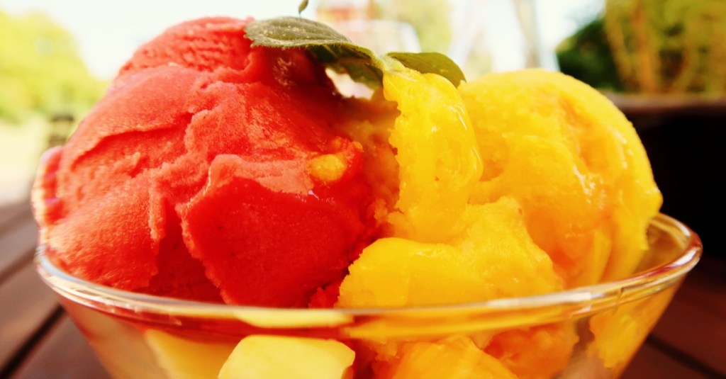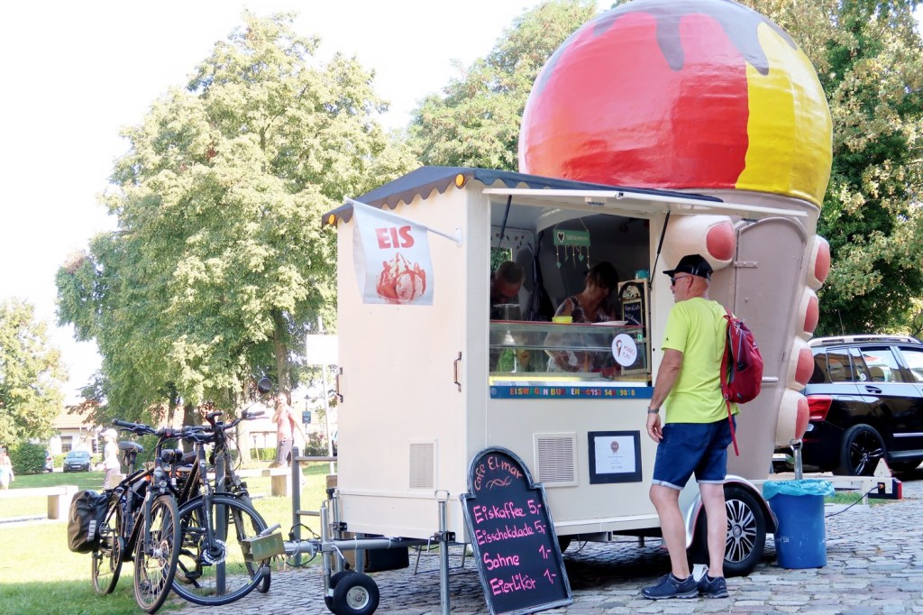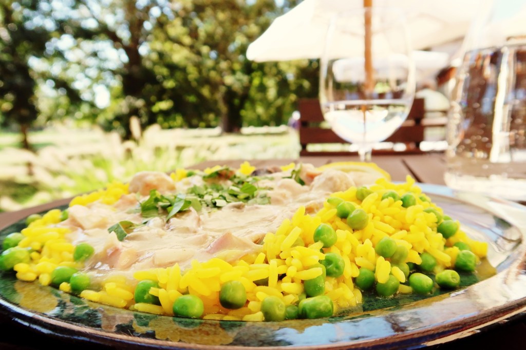 Auf der Terrasse der Gutsküche ließ ich den Tag ausklingen und es mir gut gehen. Es gab MÄRKISCHES HÜHNERFRIKASSEE vom Bio-Hofhuhn mit Champignons, Kapern, dazu Erbsen-Reis (18,00 Euro), Zwei Kugeln SORBET mit Früchten (5,00 Euro). Dazu eine Karaffe Wasser ›Classic‹ (1 Liter/ 3,00 Euro). Aus dem Hofladen nahm ich noch eine Auswahl von den dort selbst erwirtschafteten Produkten mit nach Berlin. Lecker!