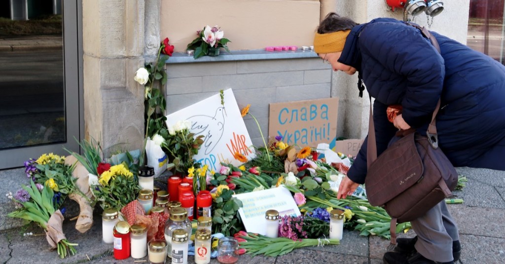 Blumenablage an der Botschaft der Ukraine. Russische Einrichtungen werden durch Absperrungen und ein massives Polizeiaufgebot geschützt.