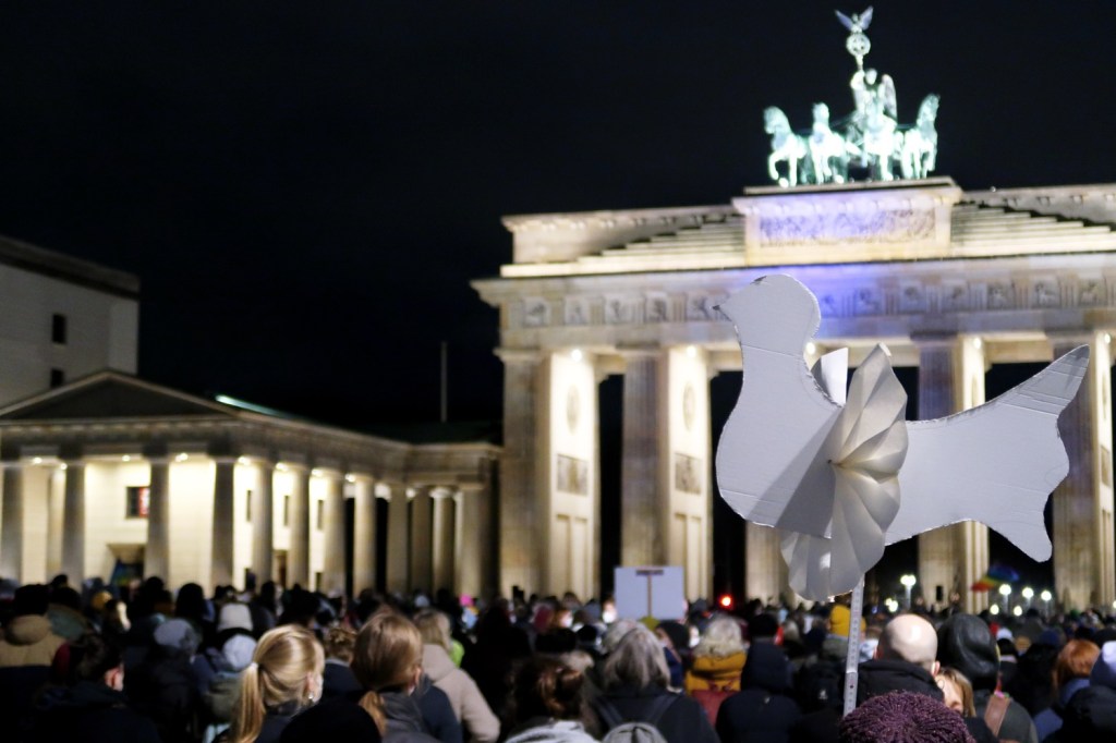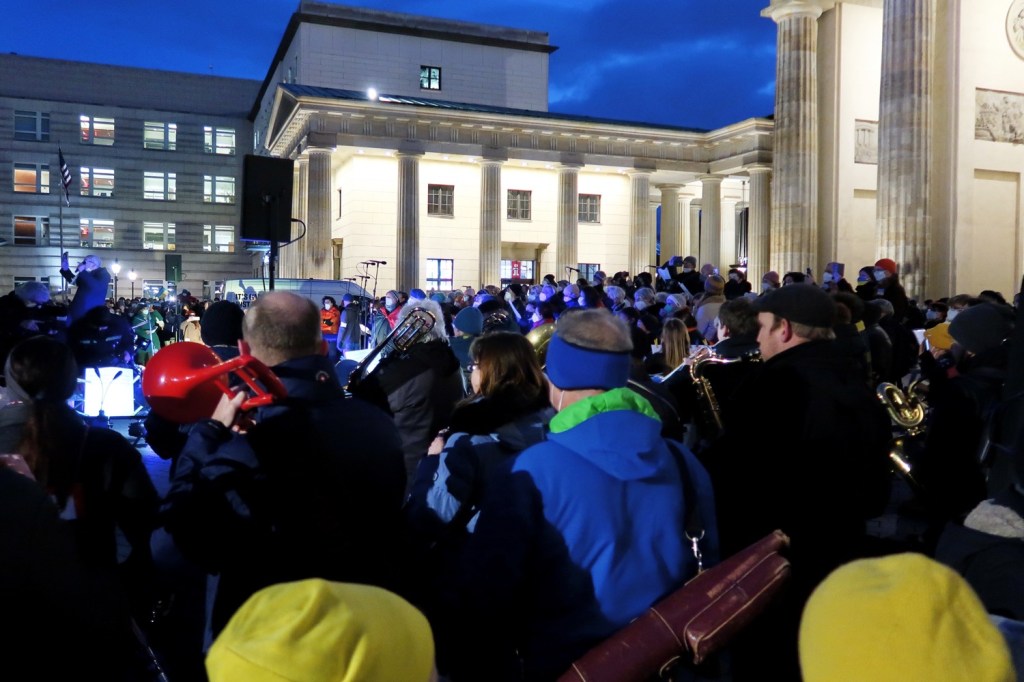 Tausende erhoben am Freitagabend vor dem BRANDENBURGER TOR ihre Stimmen für den Frieden in der Ukraine (25.02.). Der Landesmusikrat hatte nur mit einer Hand voll Leute gerechnet. Gekommen waren aber mehr als 3.500 Berliner:innen, um mit Chören und Ensembles, Musiker:innen unter dem Motto »Kultur gegen Krieg« gemeinsam zu singen: Imagine, Dona nobis pacem (mehrstimmig), Sag mir, wo die Blumen sind, Zelenaja vyshnja & Friede, schöner Götterfunken (mit modifiziertem Text). Einer der emotionalen Höhepunkte war das Lied »Sag mir, wo die Blumen sind«. Nicht der einzige Gänsehaut-Moment an diesem bewegenden Abend! Wegen des Gefechtslärms sind die Lieder sicher nicht zum Kriegsherrn, dem Massenmörder und Rassisten Putin, vorgedrungen. Aber ein deutliches Zeichen an die armen Menschen in der Ukraine.