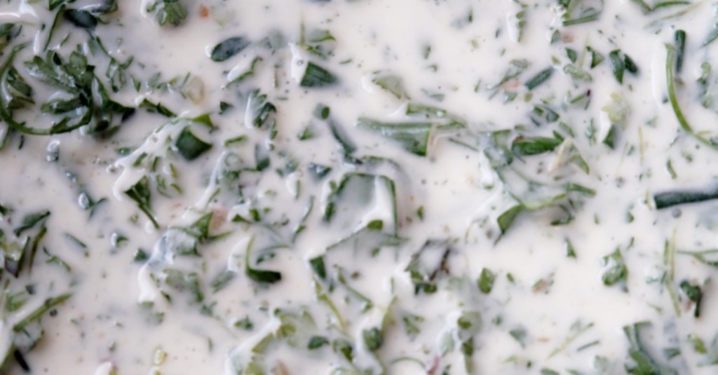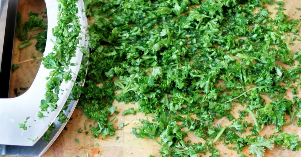 BORETSCH (ja!), KERBEL, KRESSE, PETERSILIE, PIMPINELLE, SAUERAMPFER, SCHNITTLAUCH. Mit dem Wiegemesser nicht zu klein (!) hacken. Das Familienrezept steht HIER unter GRIE SOSS, Post vom 29.03.2021, einfach herunterscrollen …