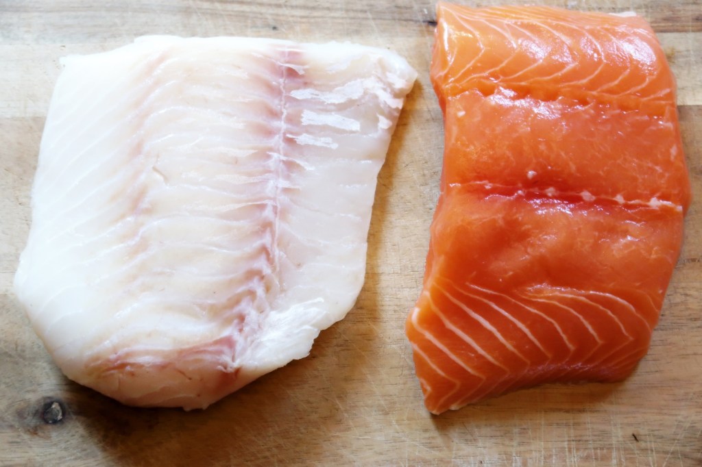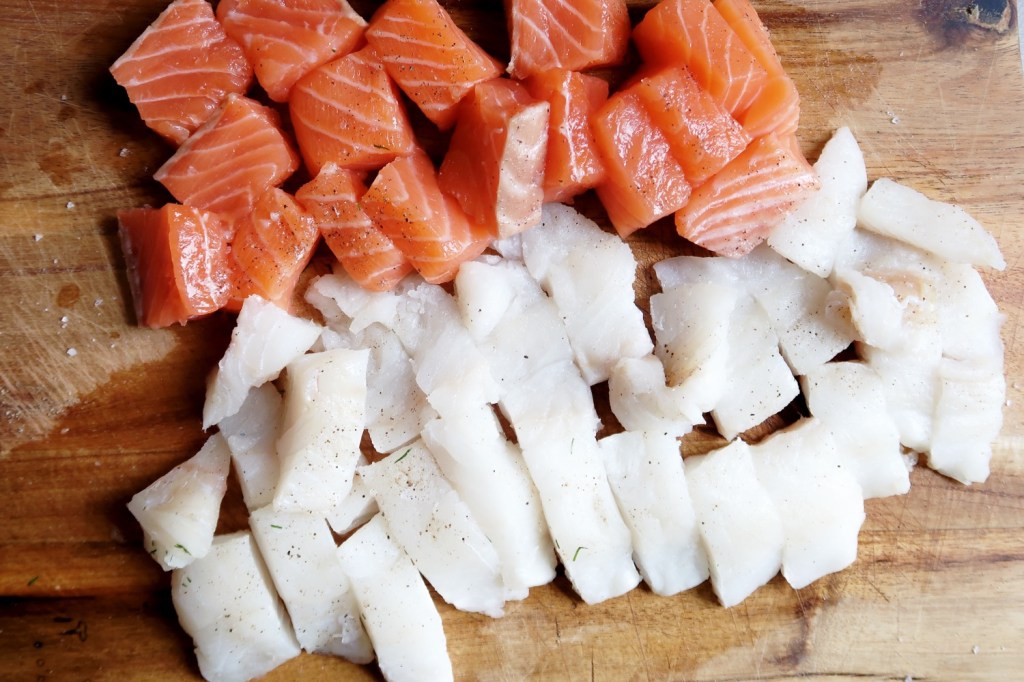 Die Milch in einer Pfanne mit Lorbeer und Pfefferkörnern zum Kochen bringen, Fisch in mundgerechte Stücke schneiden, Temperatur herunterdrehen und den Fisch ein paar Minuten simmern lassen. Fisch aus der Milch heben, beiseite stellen, Milch durch ein Sieb passieren, beiseite stellen.