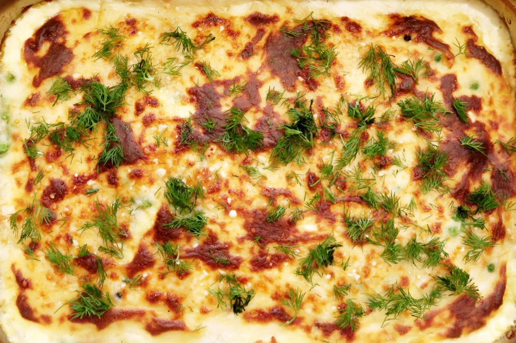 In einer Pfanne die Butter schmelzen, nicht bräunen lassen, Mehl in die Butter geben, Mehl unter ständigem Rühren etwas anrösten, langsam die noch warme Milch hinzugeben, unter beständigem Rühren aufkochen, bis alles andickt, vielleicht etwas Weißwein dazu geben. Fünf Minuten simmern lassen, bis sich eine dicke Soße ergibt, salzen. Pfanne von der Herdplatte ziehen, Fischstücke, Erbsen und die Hälfte des geriebenen Käses hinzugeben, Petersilie und Dill grob hacken, einrühren, alles in die Auflaufform füllen.